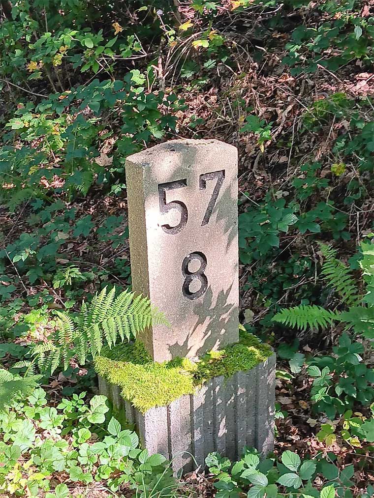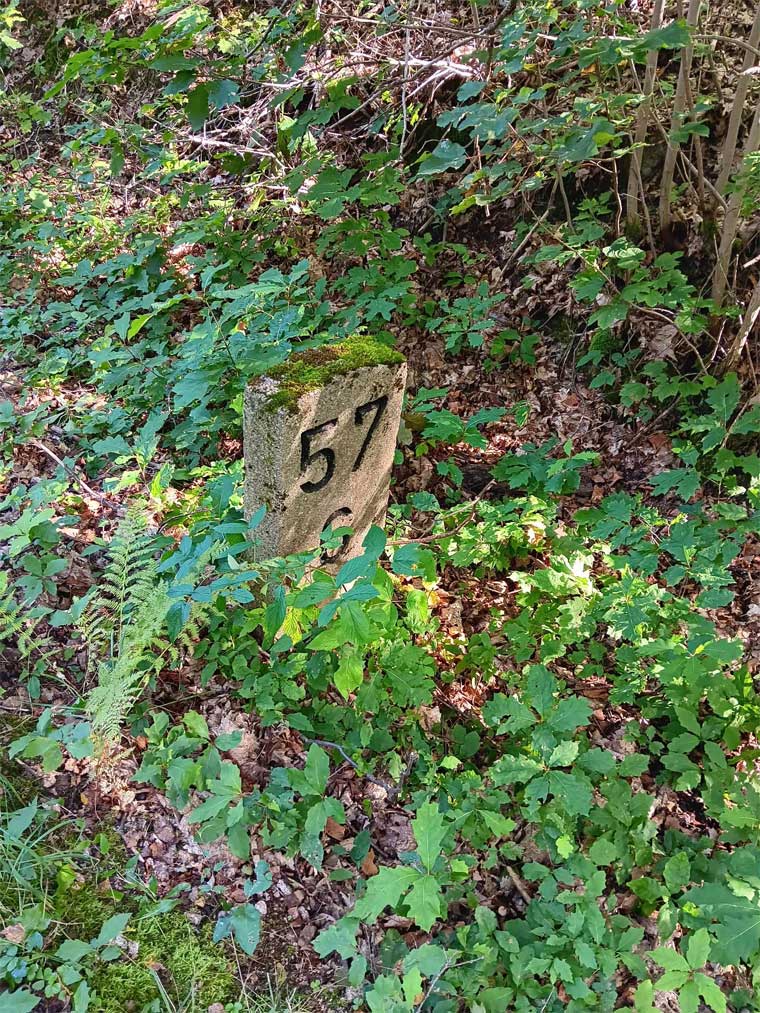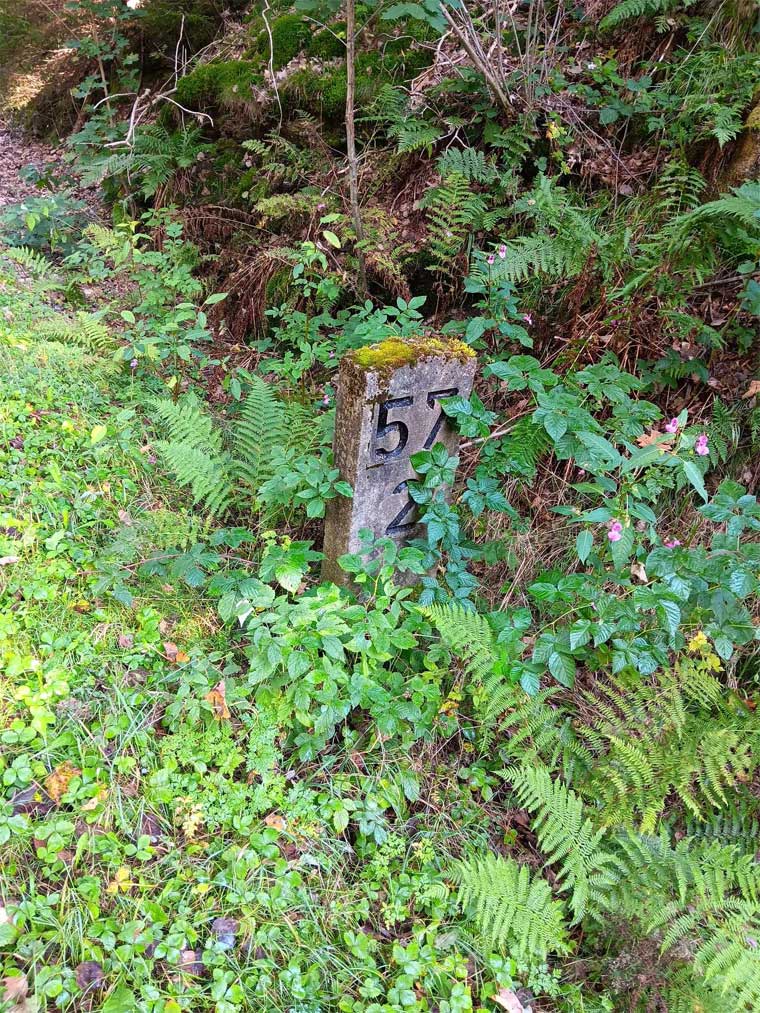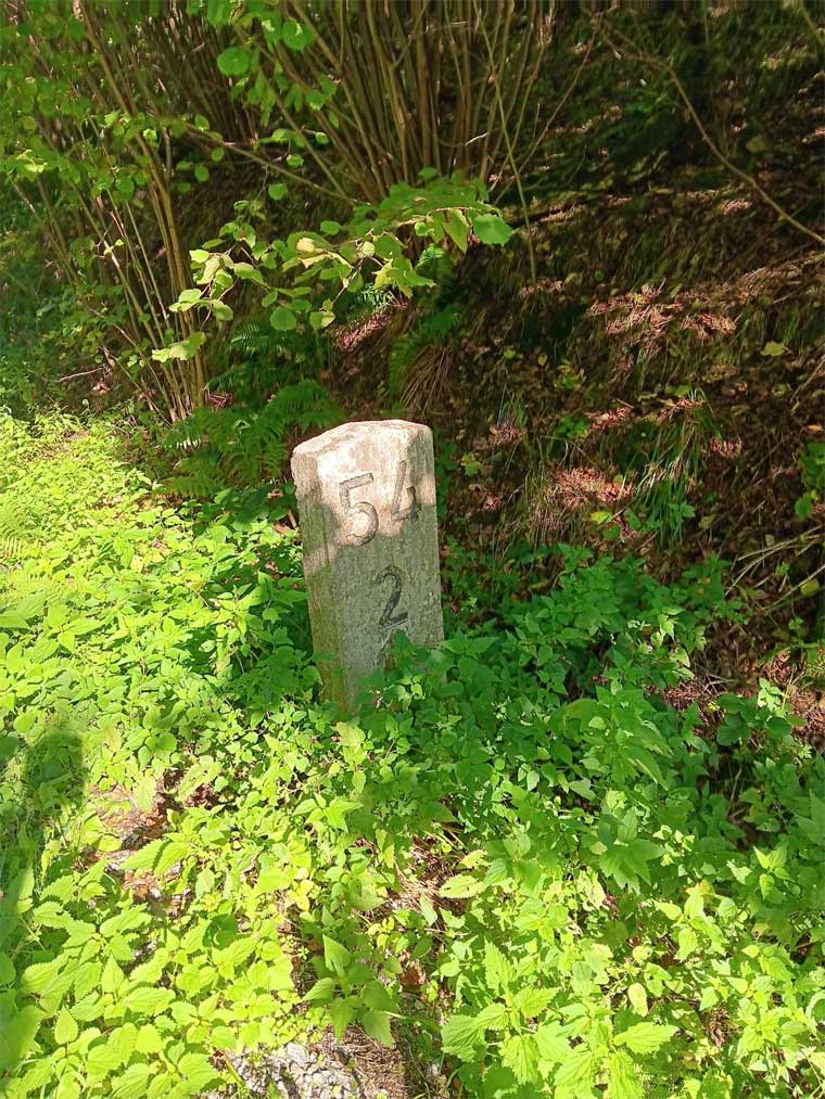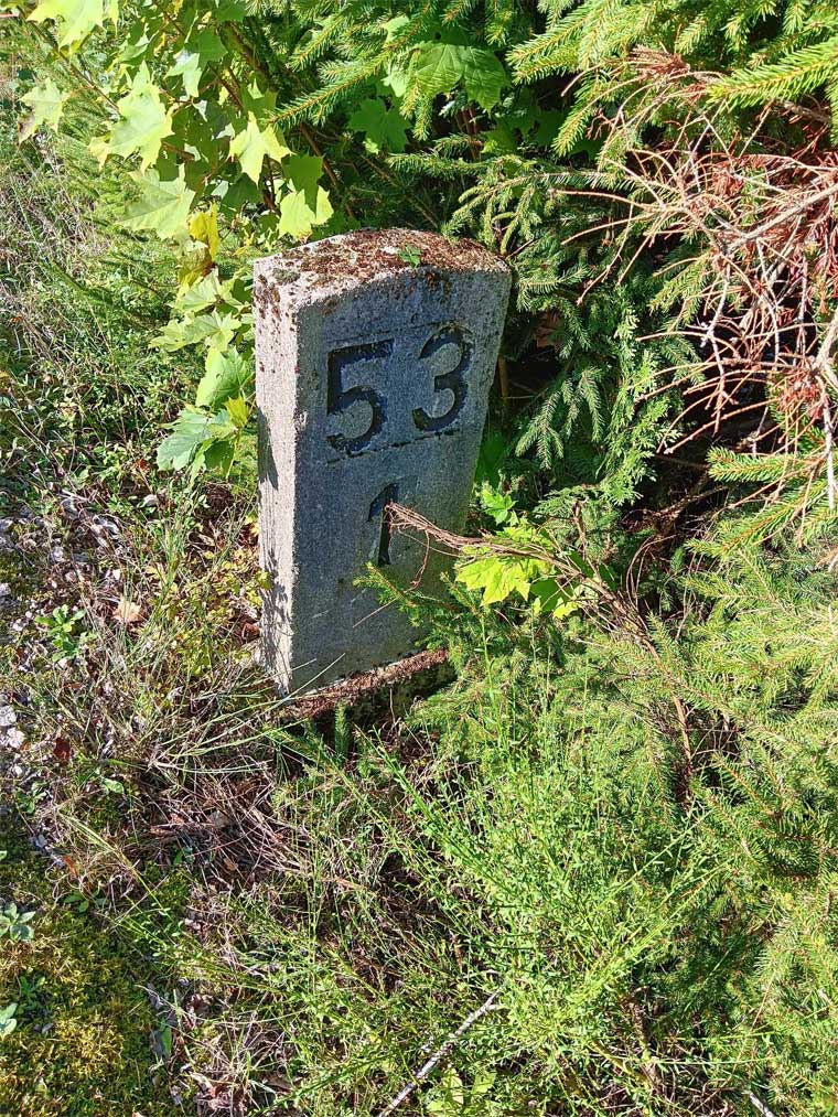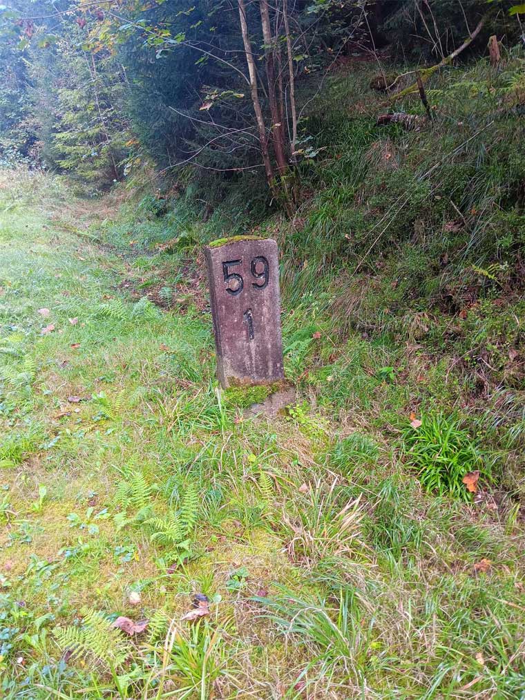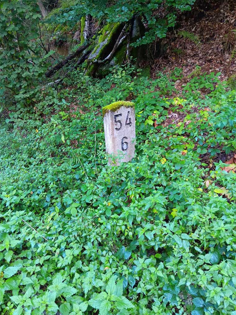 Davor der alte Myriameterstein 6 mit oben angebrachter Zahl 600 hm.
