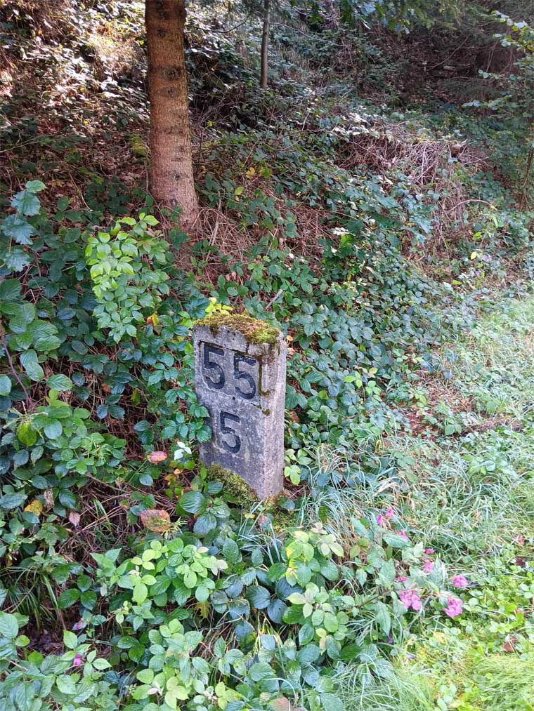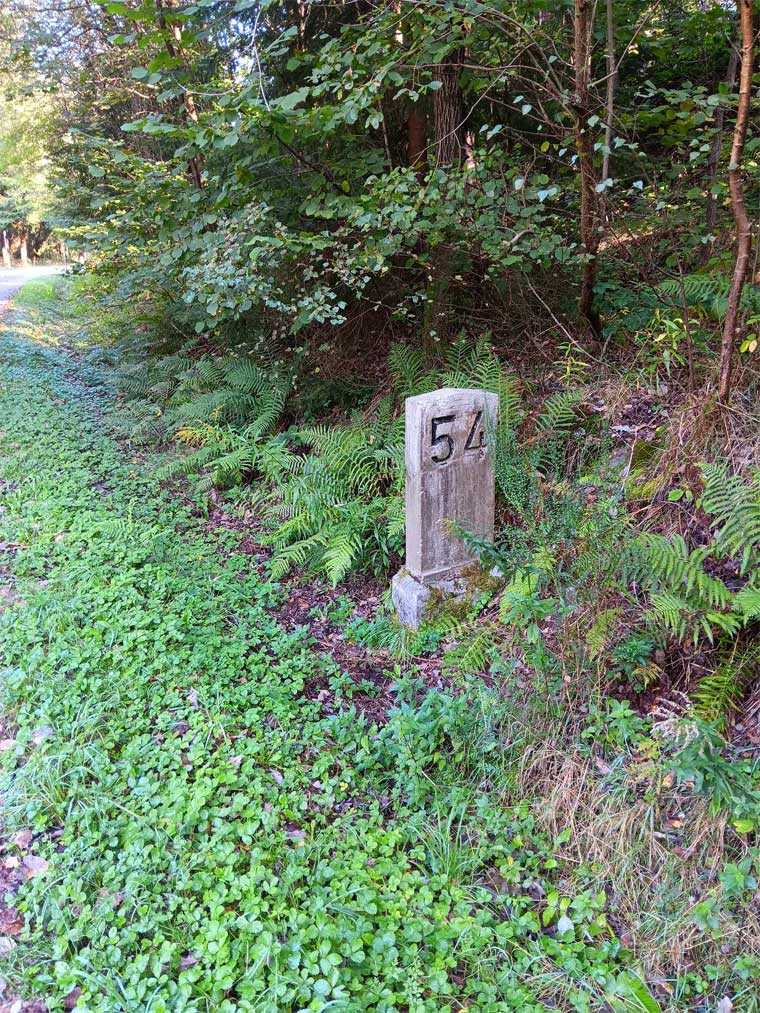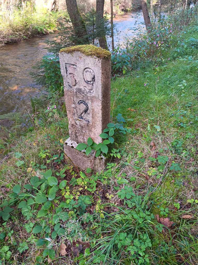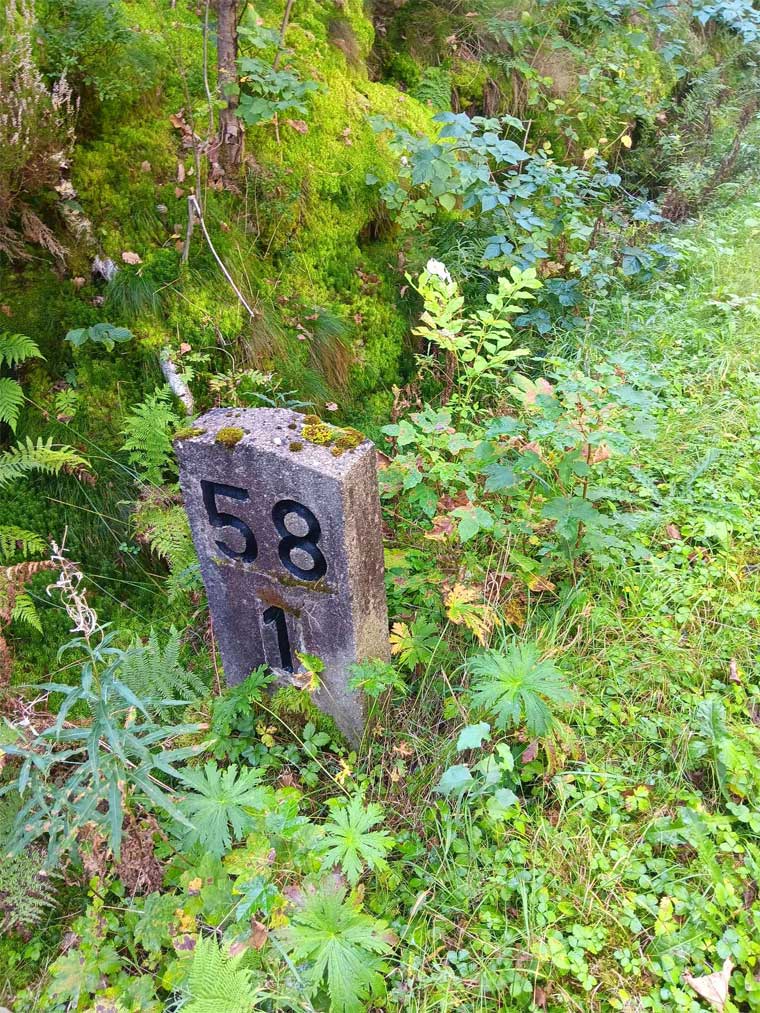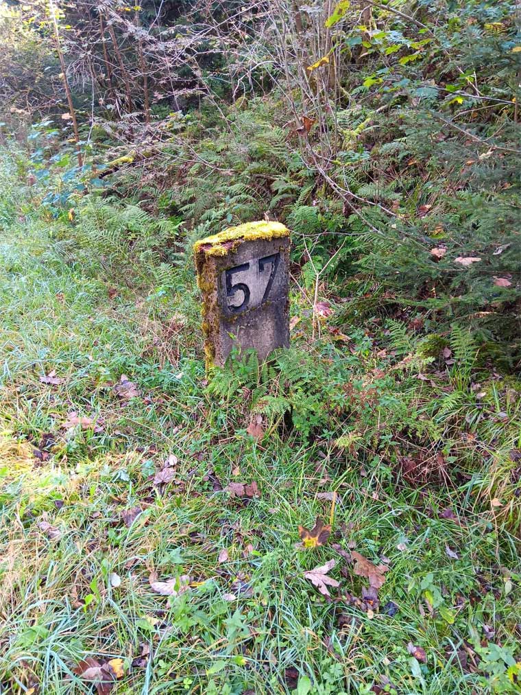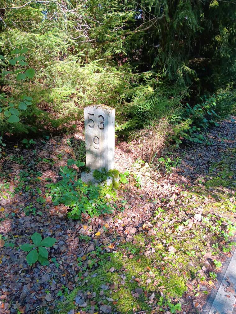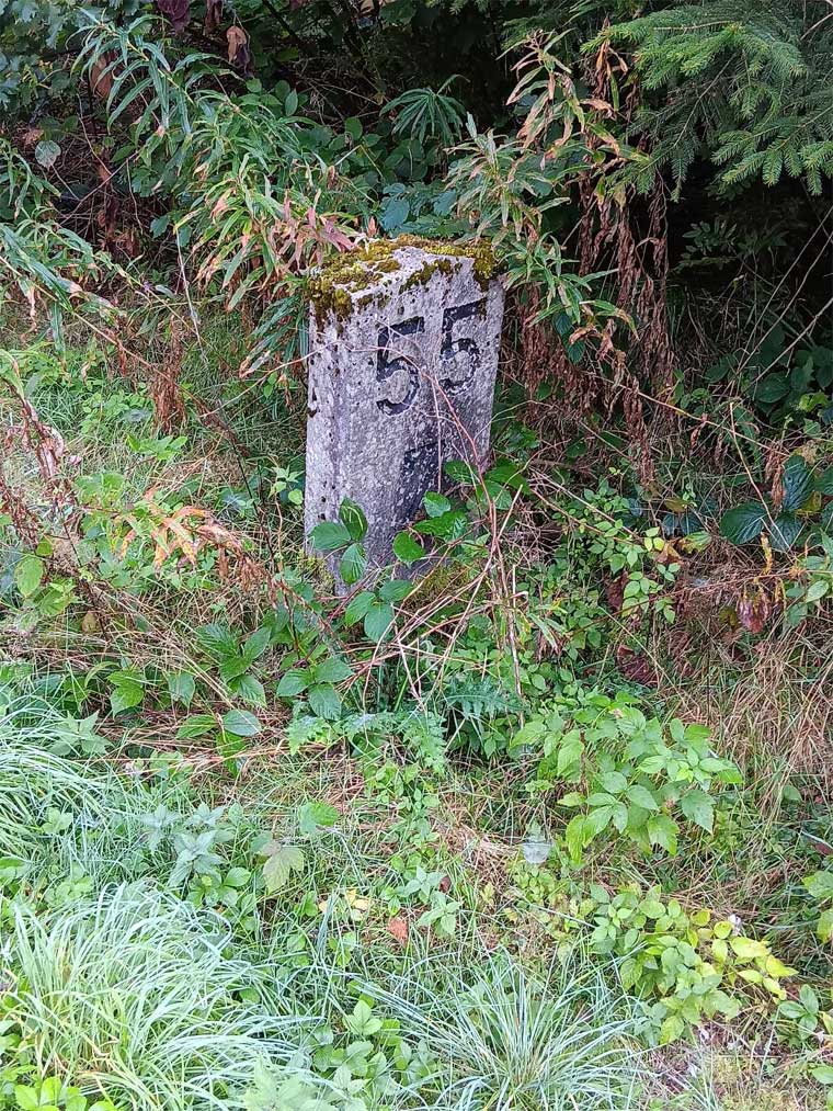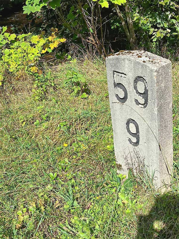 Davor der alte Myriameterstein 6 mit oben angebrachter Zahl 600 hm.