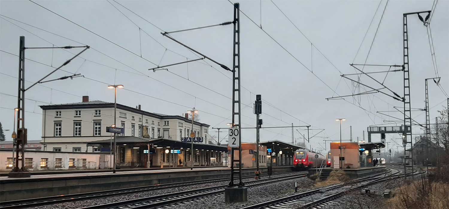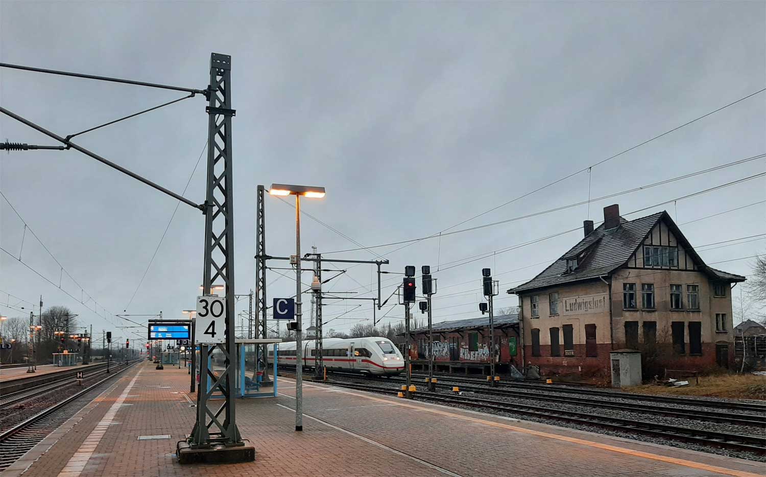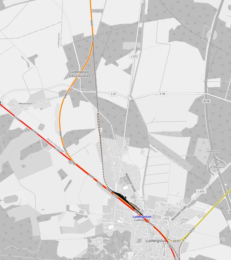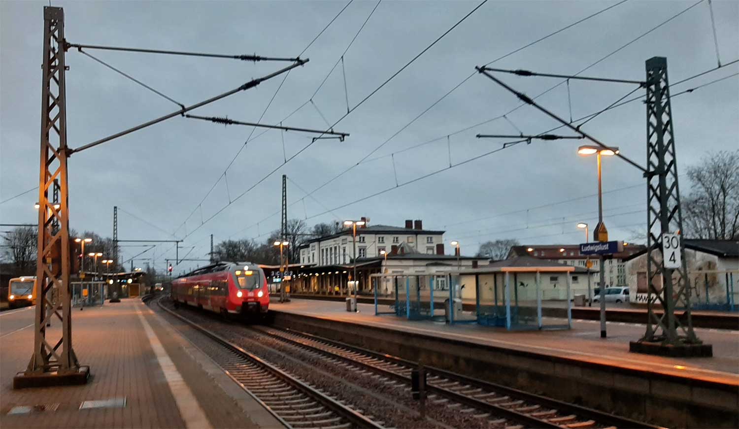 Ludwigslust | 30,39 | km 170,76 der Strecke Berlin Hamburger Bf (Lehrter Bf) 0,0 - Wittenberge 126,79 - Büchen 239,23 - Schwarzenbek 249,23 - Hamburg Hbf 286,66 - Hamburg-Altona 293,16 (6100) |