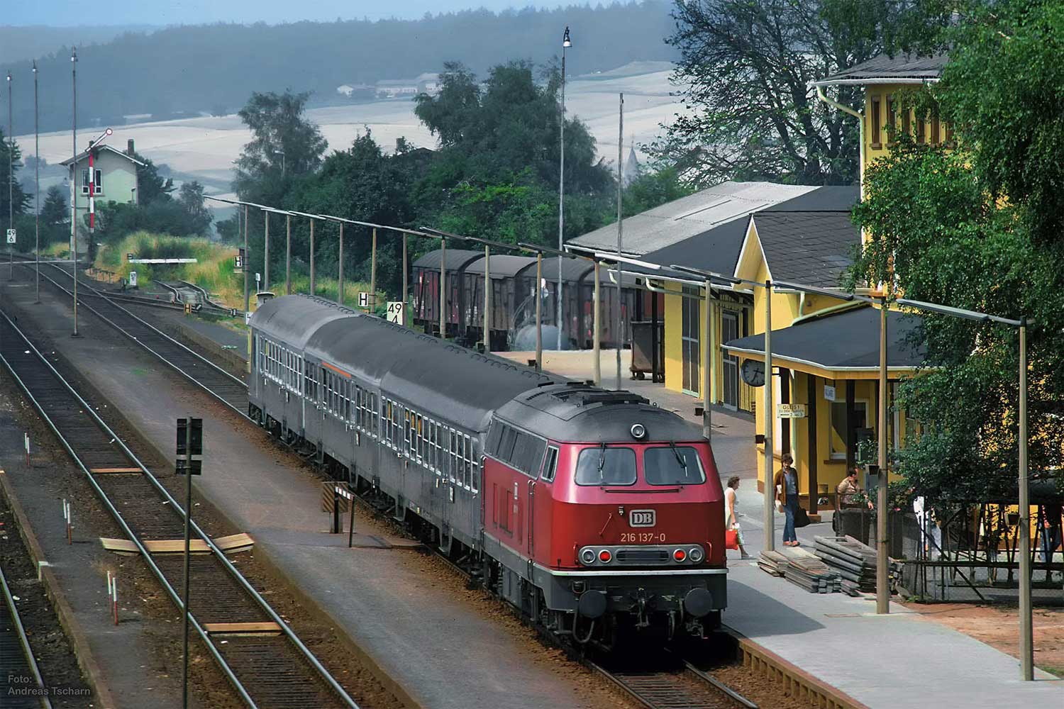 216 137 mit dem Wendezug 5626 (Wiesbaden Hbf - Limburg), an der Zugspitze ein beige-ozeanblauer Steuerwagen („Karlsruher Kopf“).