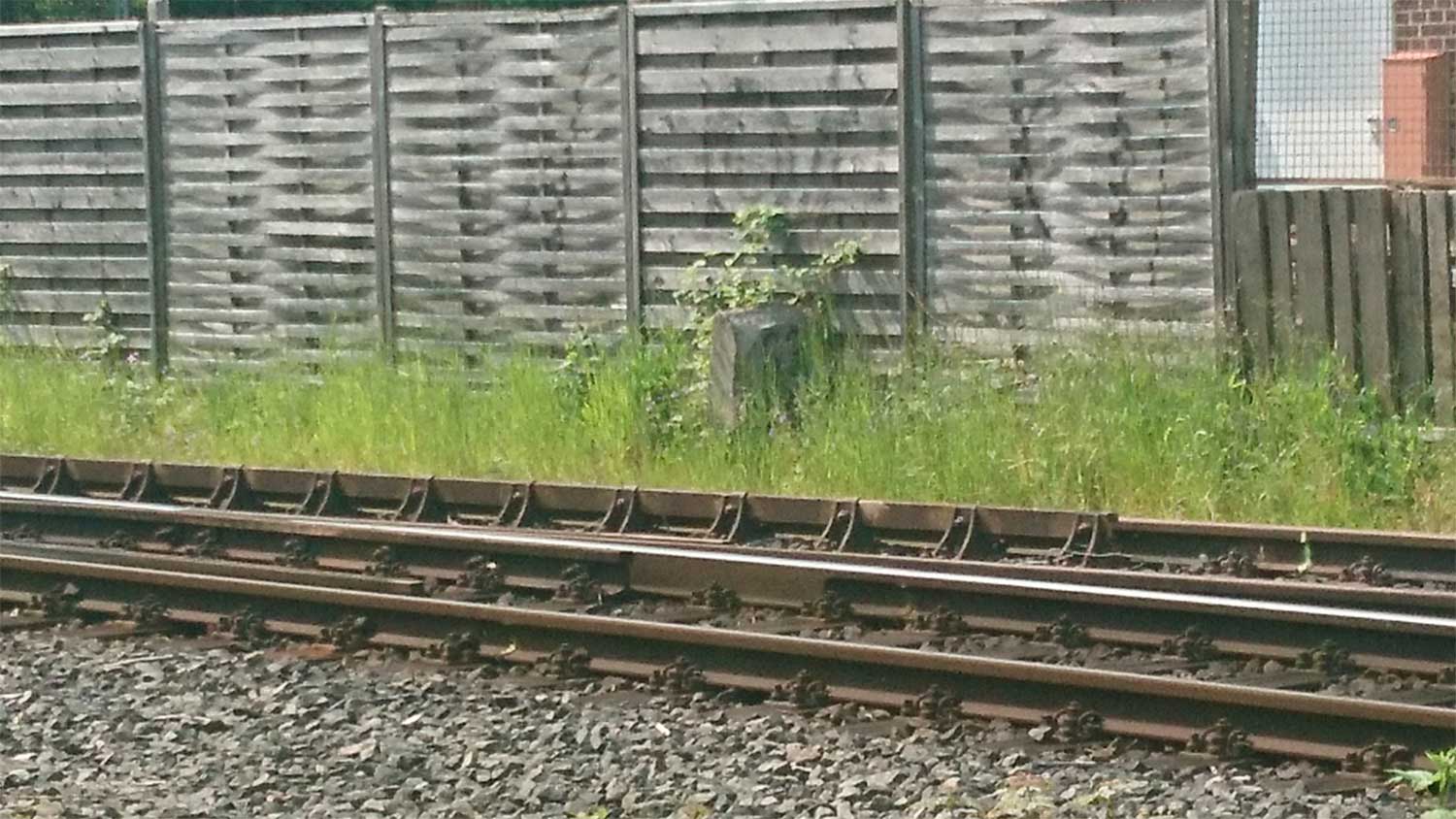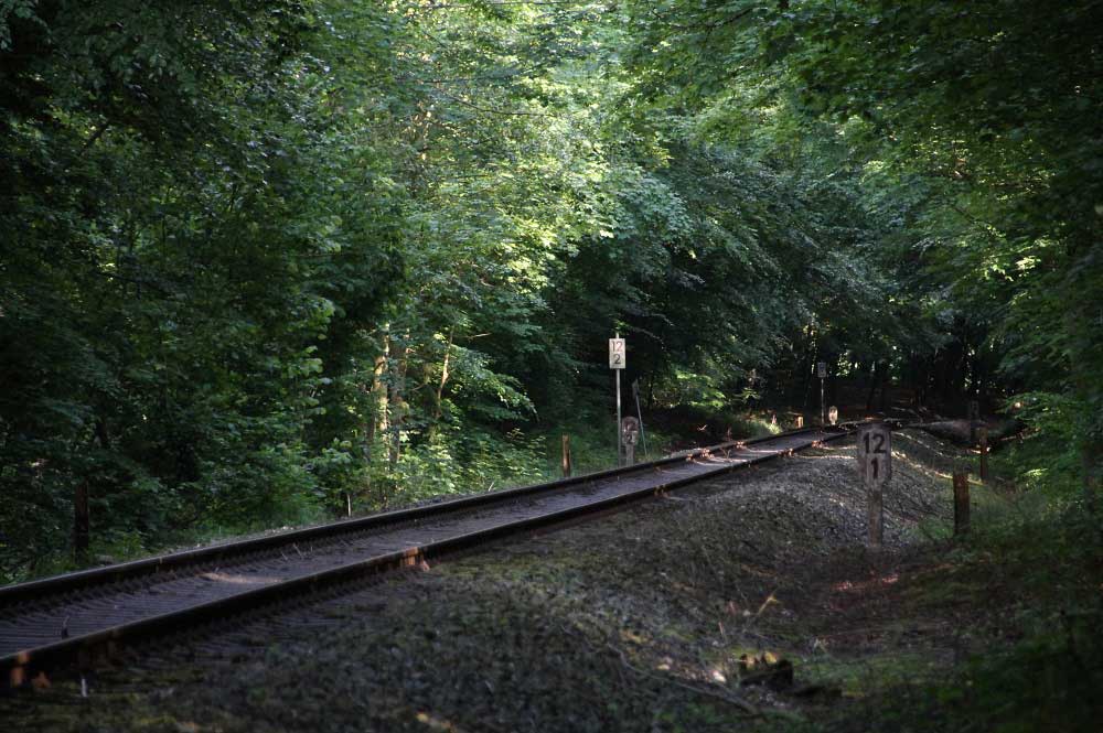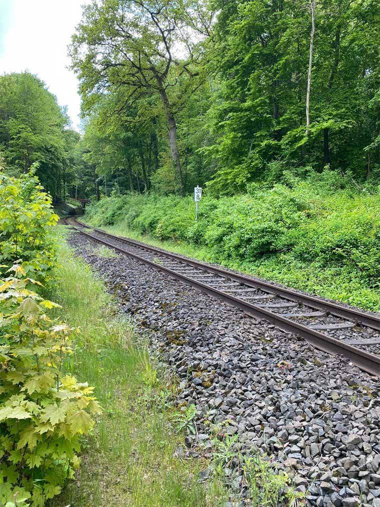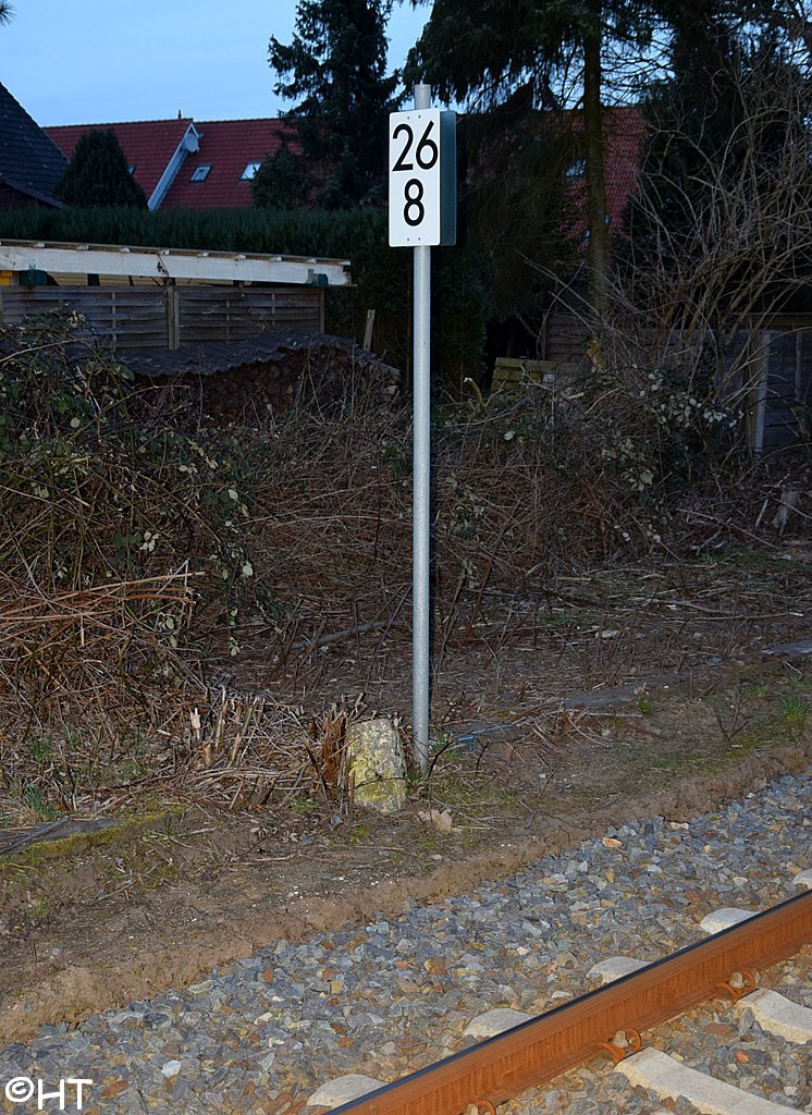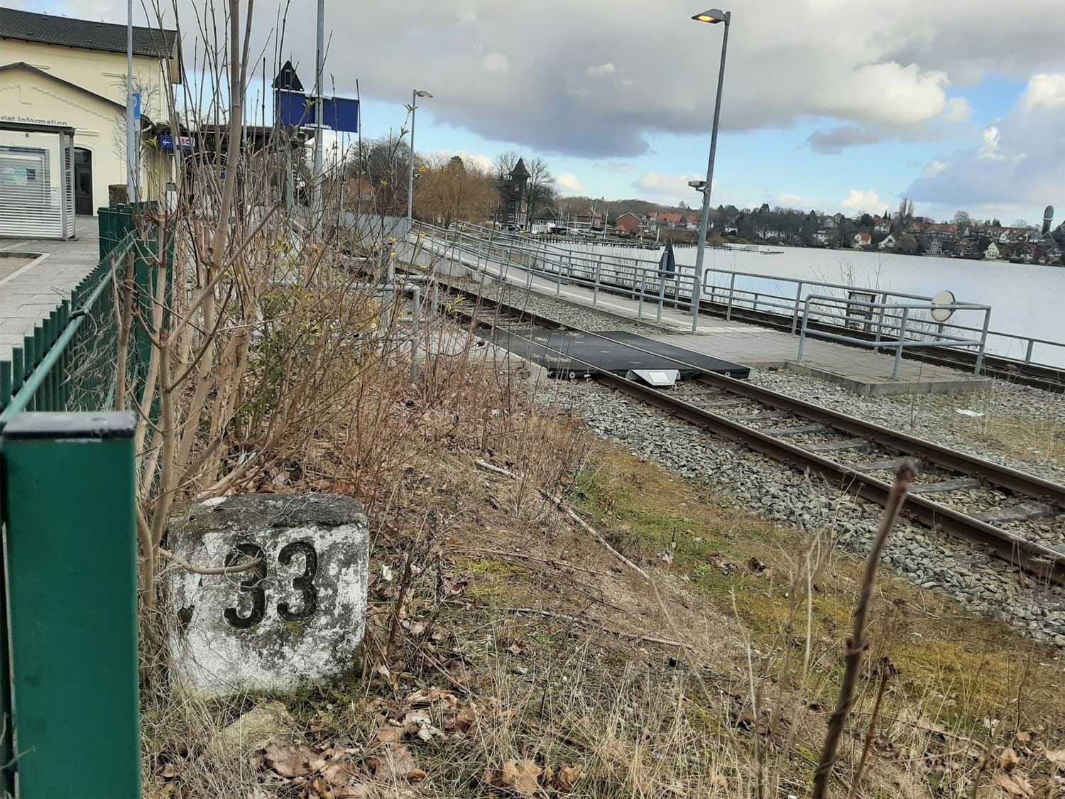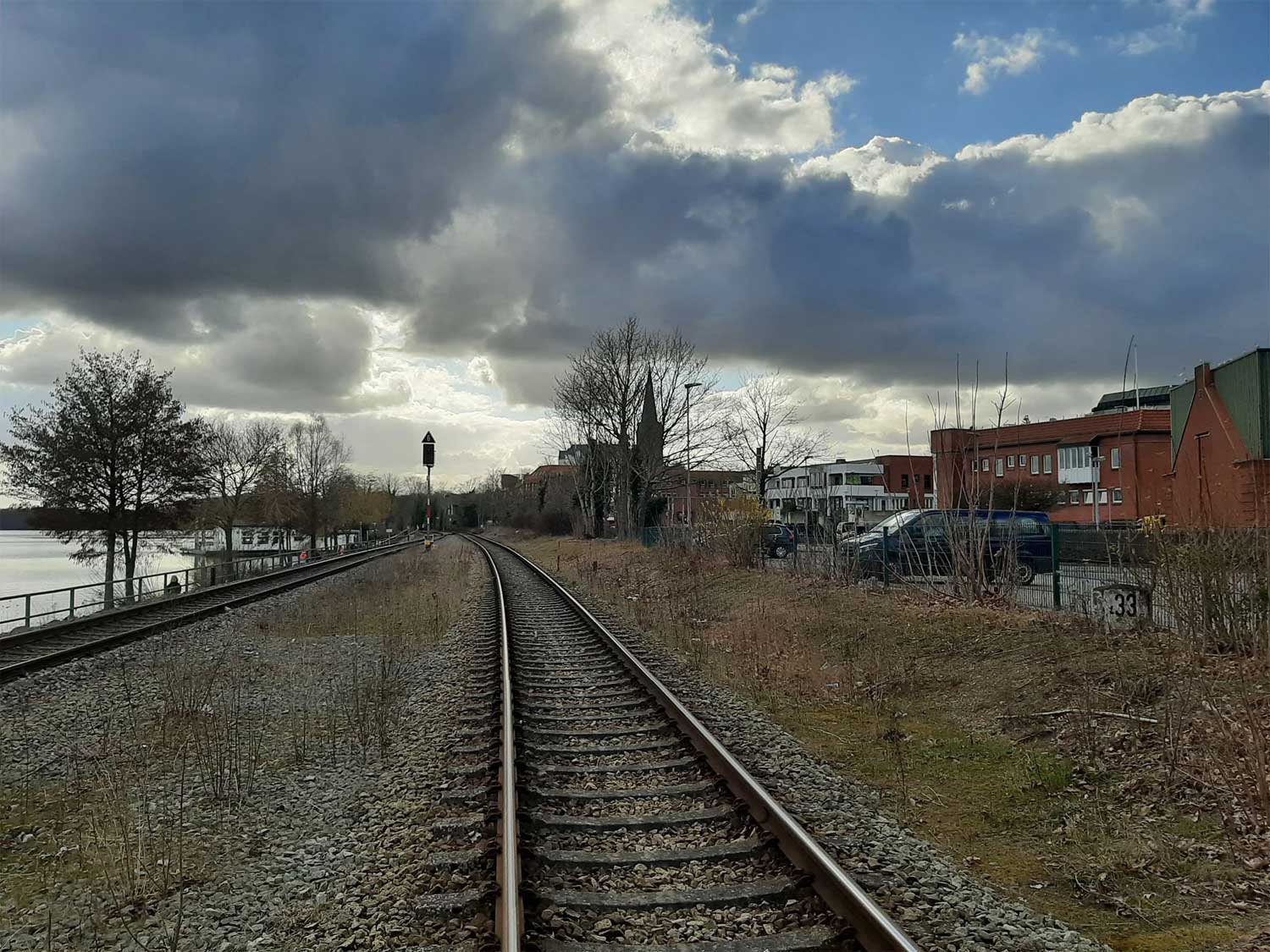 Im Vordergrund das Gleis der Strecke Eutin 0,0 - Bad Schwartau 26,93