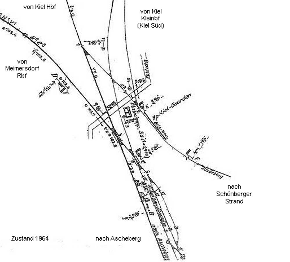 | Verbindungsgleis zur Strecke Kiel Klbf 0,0 - Schönberger Strand 24,1 (Kleinbahn Kiel - Schönberg) und zur Strecke Kiel Klbf 0,0 - Wankendorf Klbf 24,8 - Bad Segeberg 51,0 (Kleinbahn Kiel - Segeberg)] | ||