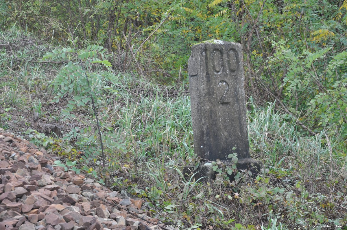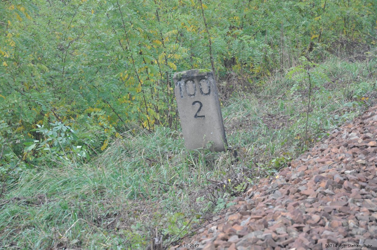 km 100,3 (Stein) und km 100,4 (Tafel) zwischen Ruhland und Lauchhammer Süd