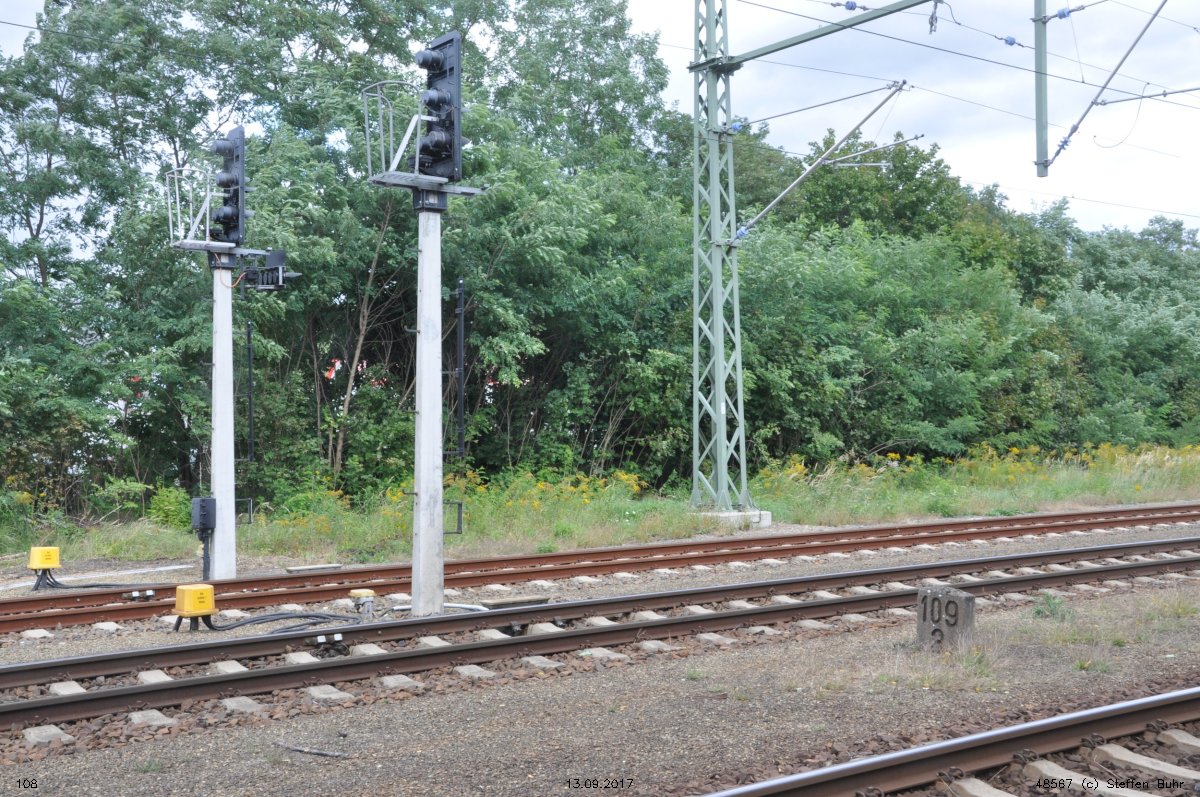 km 107,3 (Stein) und km 107,4 (Stein und Tafel) zwischen Lauchhammer Süd und Lauchhammer West