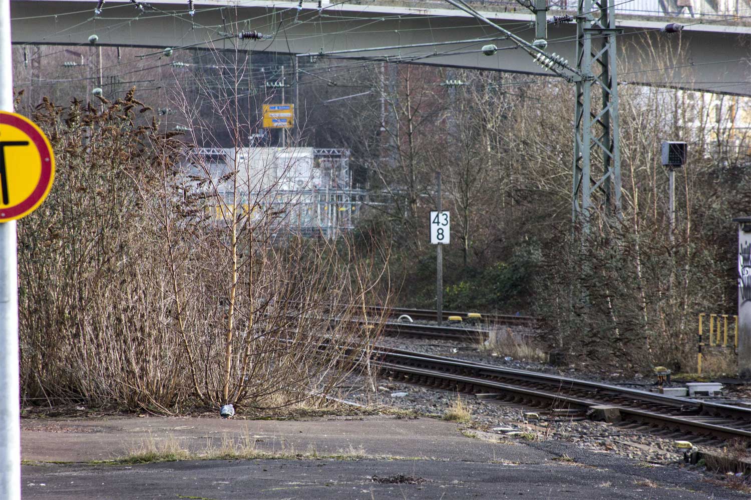 | km 36,17 der Strecke Köln Hbf 0,0 - Neuss Hbf 36,17 - km 37,0 + 1900 m = km 37,100 (Überlänge 1800 m) - Krefeld Hbf 53,56 - Kleve 118,38 - Streckenunterbrechung - [Kranenburg Grenze 131,100 - (Nimwegen)] (2610) | ||