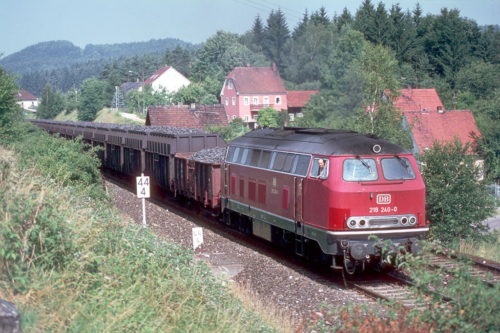 km 58,1 in Sulzbach-Rosenberg Hütte - Links am Bahnsteig 217 002, rechts mit Güterzug 217 022
