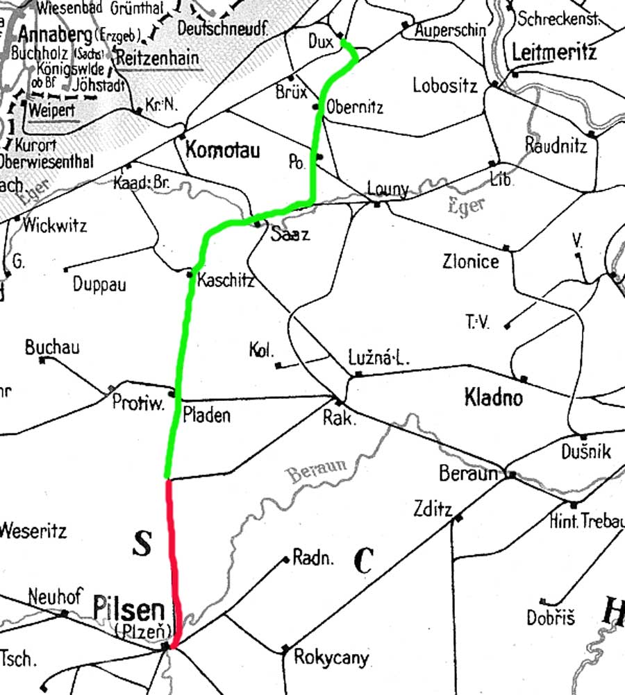 Pilsen / Plzeň 0,0 - Mlatz / Mladotice 40,18 = km 137,45 - Grenze Protektorat Böhmen und Mähren/Sudetengau 143,27 - Pladen 156,74 - Kaschitz 186,63 - Saaz Stadt 203,84 - Obernitz 232,85 - Bilin 243,14 - Dux 247,92