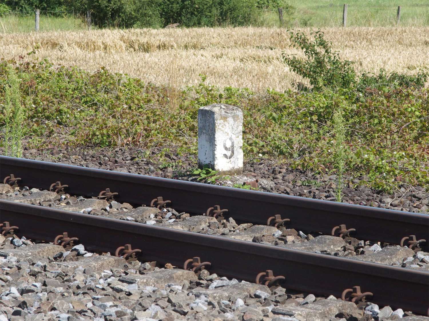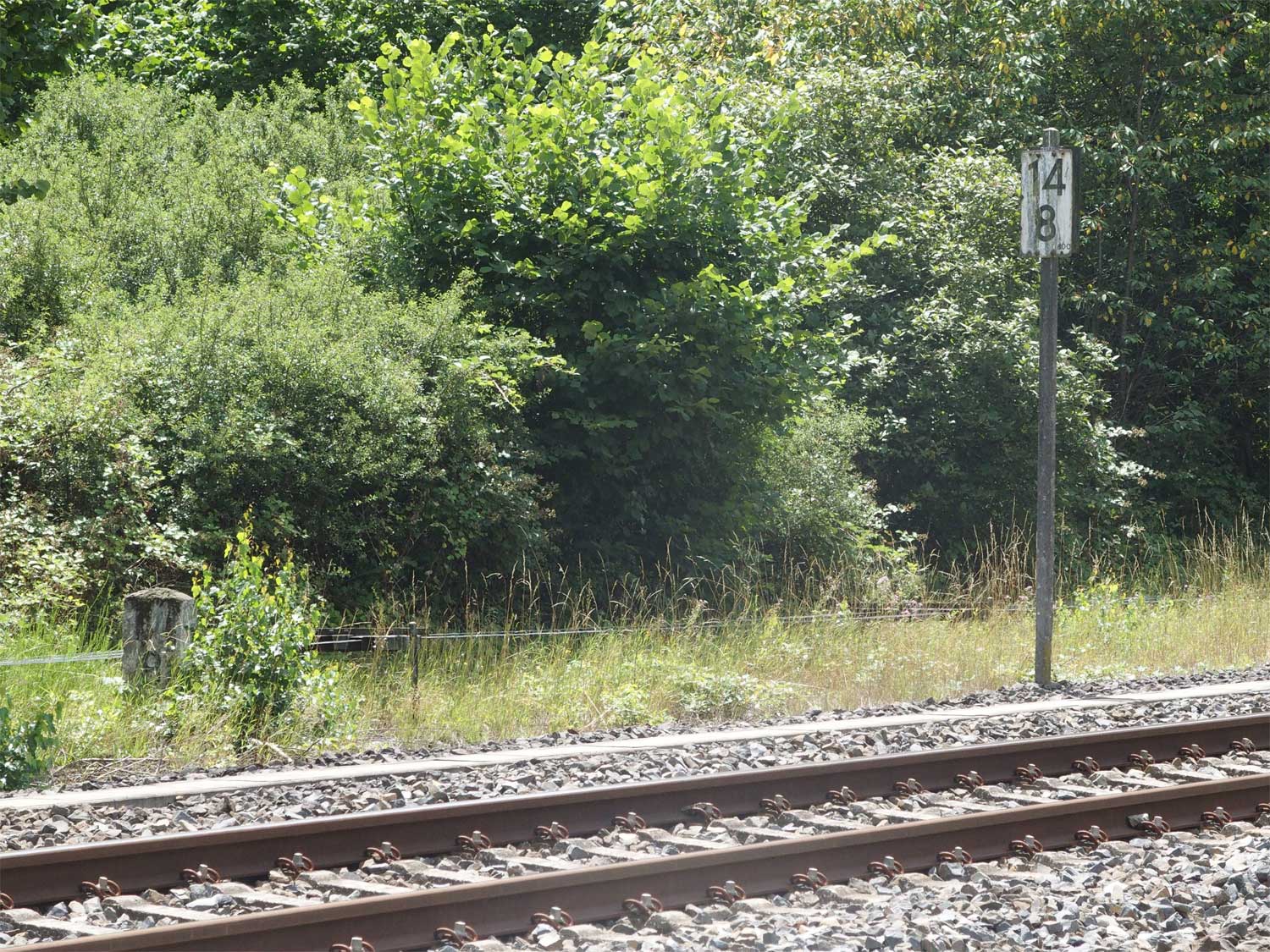 km 21,6 (Tafel im Hintergrund); km 21,7 (Stein rechts neben den Gleisen) und km 21,8 (Stein im Vordergrund) zwischen Löhnberg und Weilburg - Blick Richtung Wetzlar