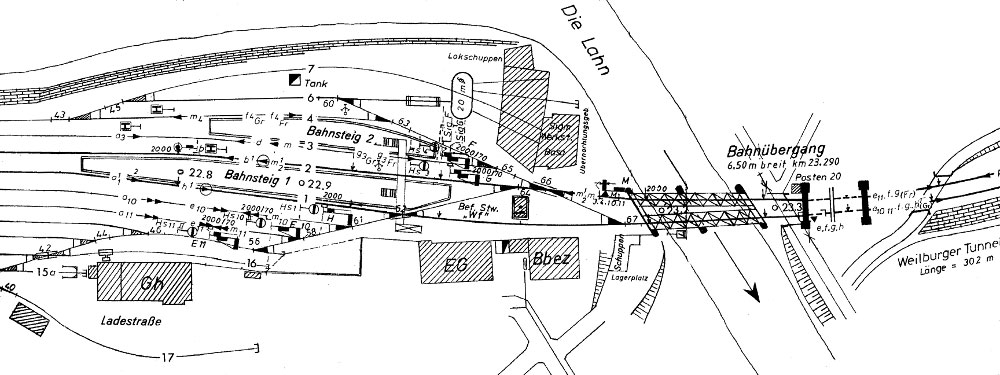 An der südliche Bahnhofsausfahrt wurde direkt die Lahn und eine Straße überquert, danach verschwand die Strecke in dem 302 Meter langen Weilburger Tunnel.