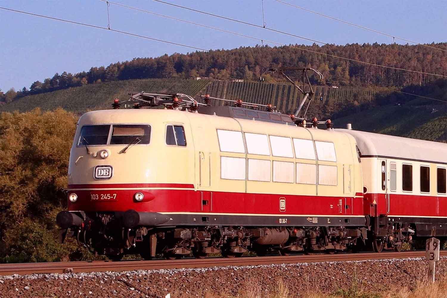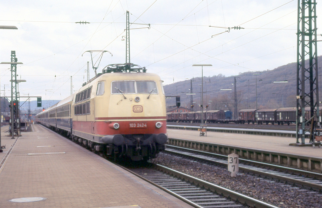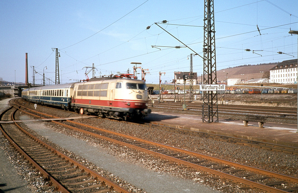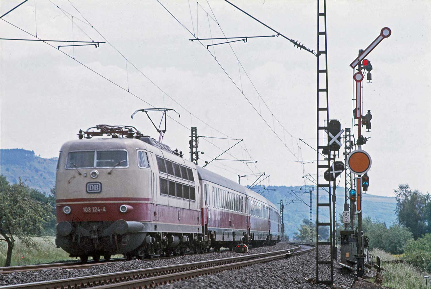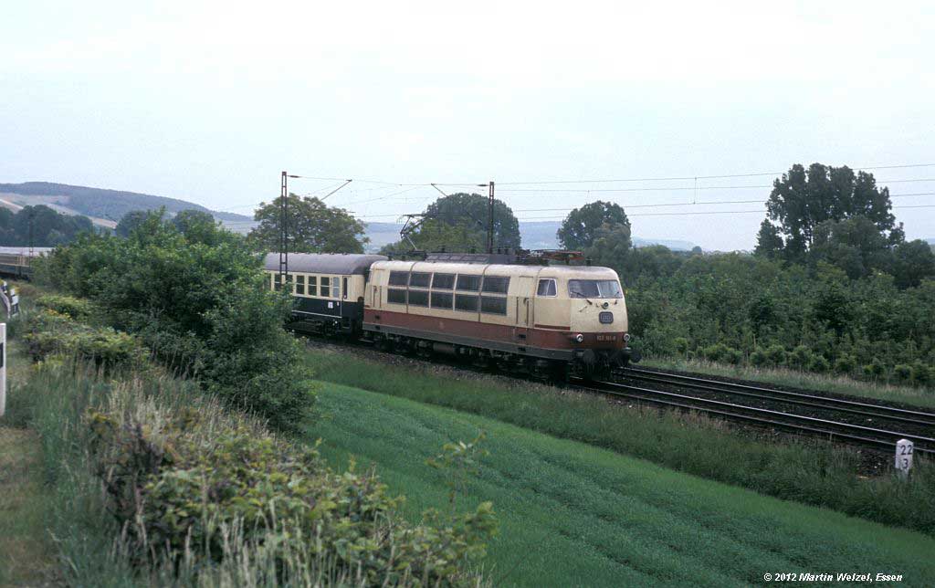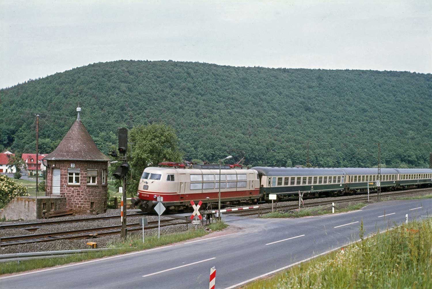 Der Zug mit der 103 194 befindet sich auf der Strecke Flieden 0,0 - Gemünden (Main) 56,338