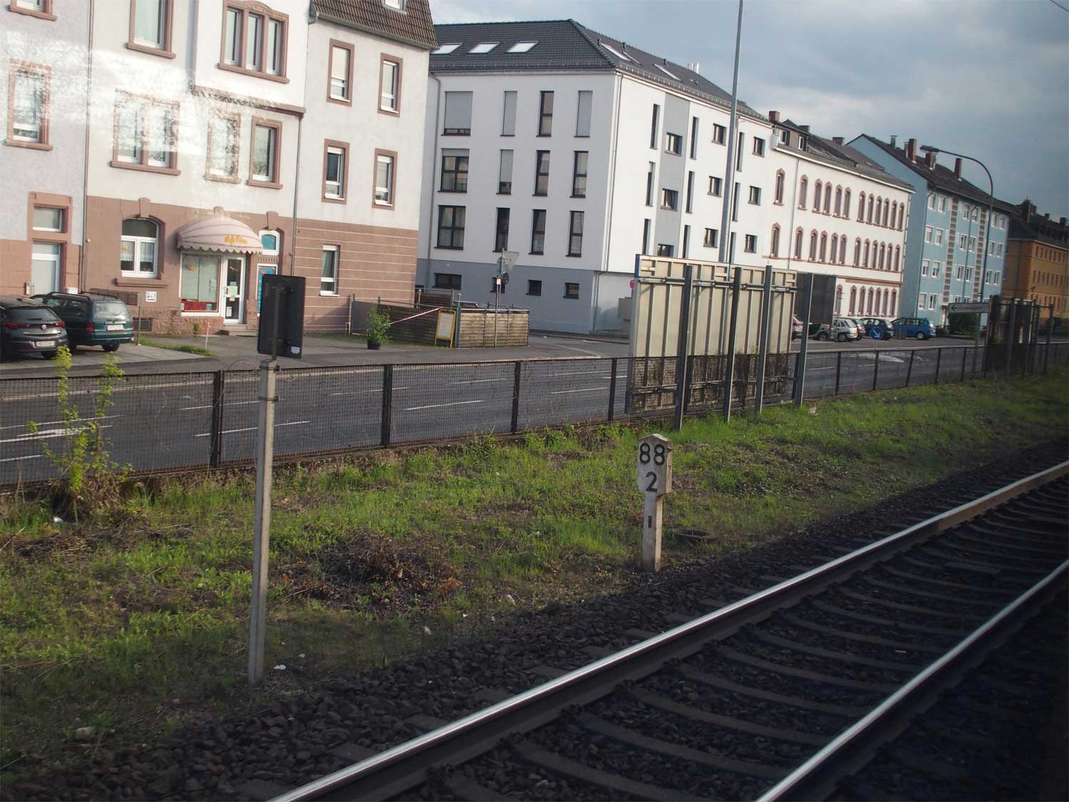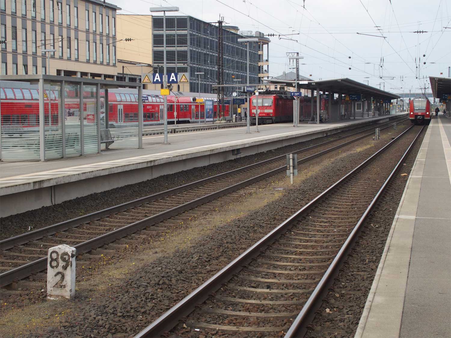 km 89,0 (Stein und Tafel) in Aschaffenburg Hbf - Blick Richtung Würzburg