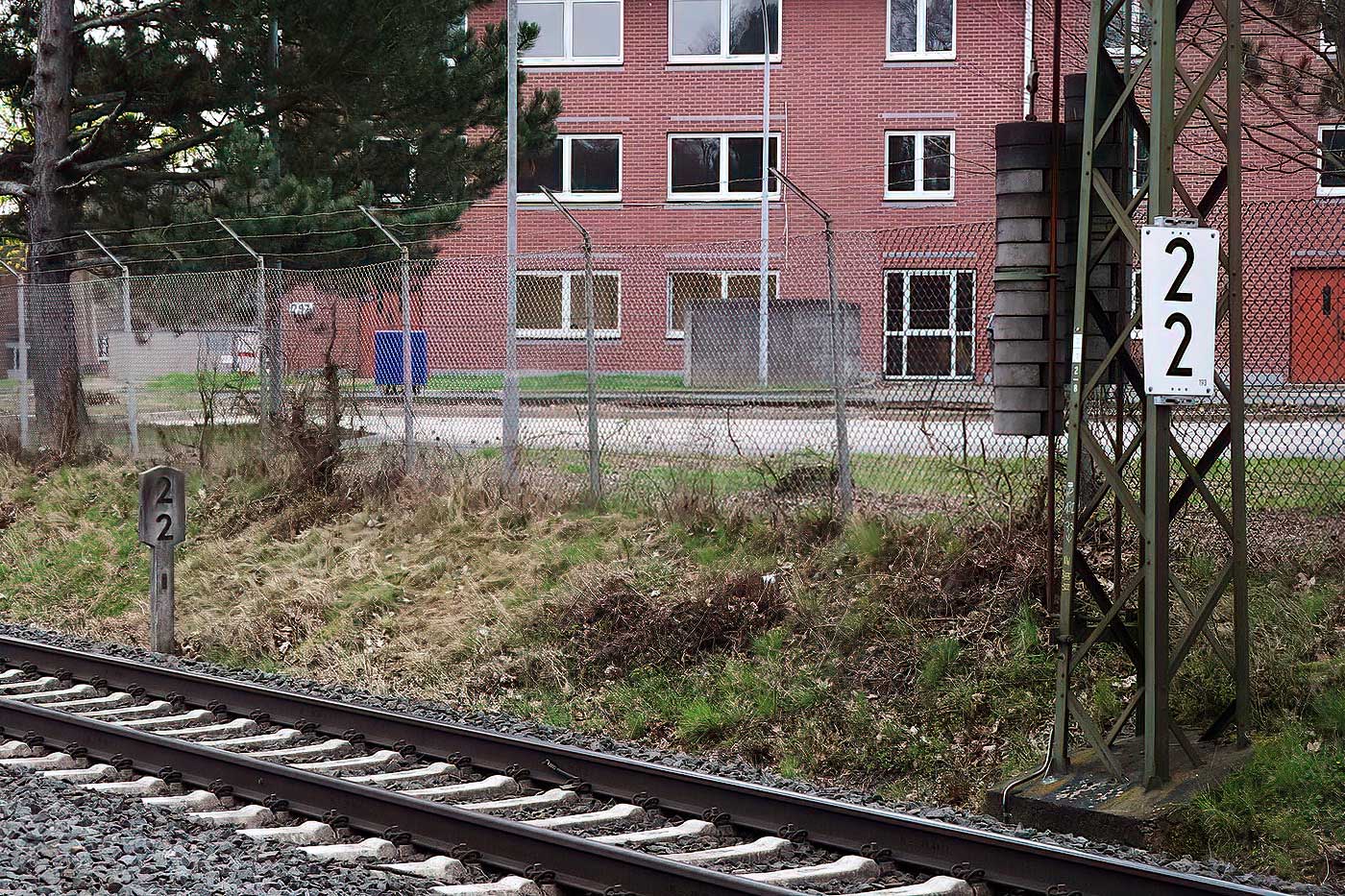 km 1,8 (Stein und Tafel) und km 1,9 (Stein) zwischen Abzw Hanau Rauschwald und Großkrotzenburg - Blick Richtung Großkrotzenburg