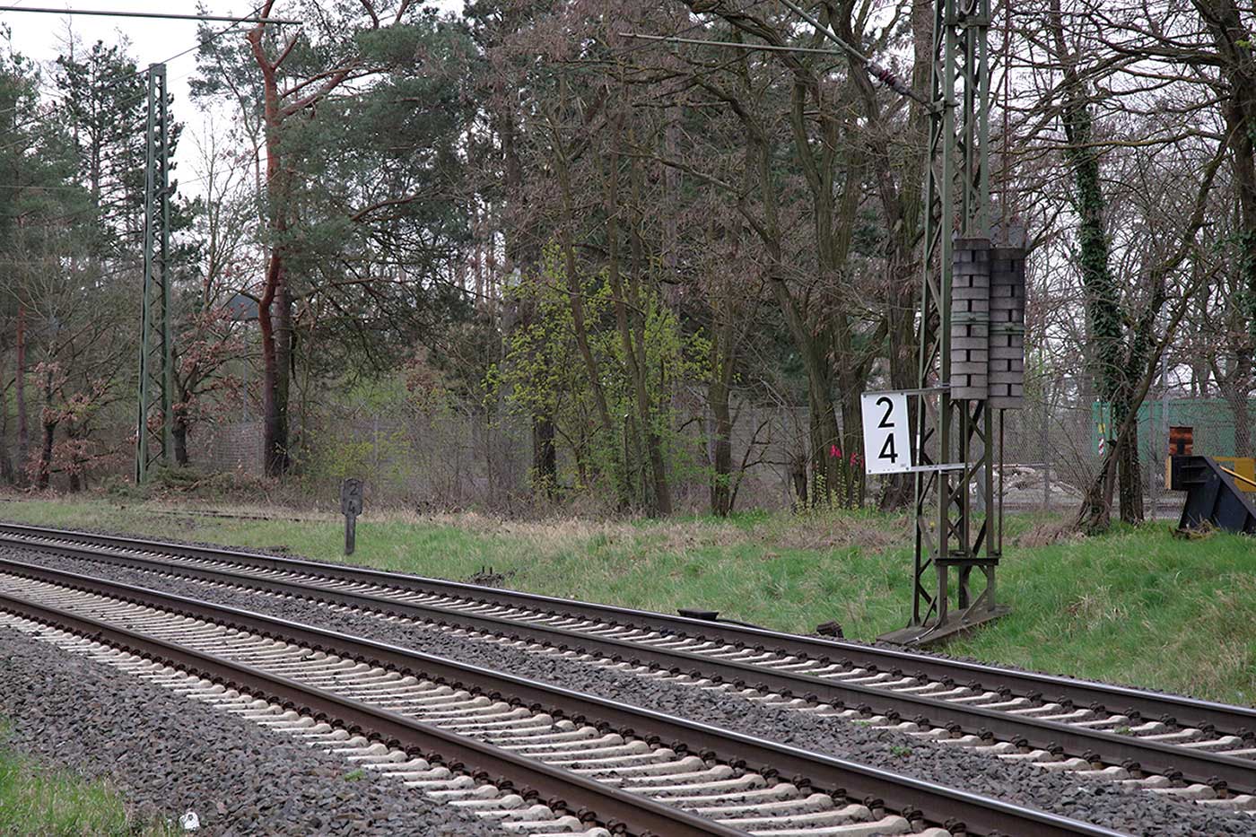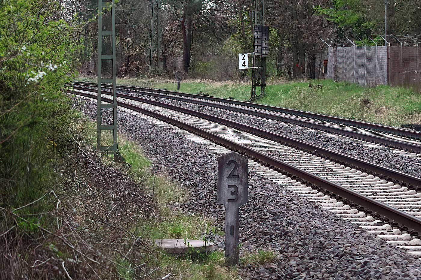 km 2,3 (Stein) und km 2,4 (Stein und Tafel) zwischen Abzw Hanau Rauschwald und Großkrotzenburg - Blick Richtung Großkrotzenburg
