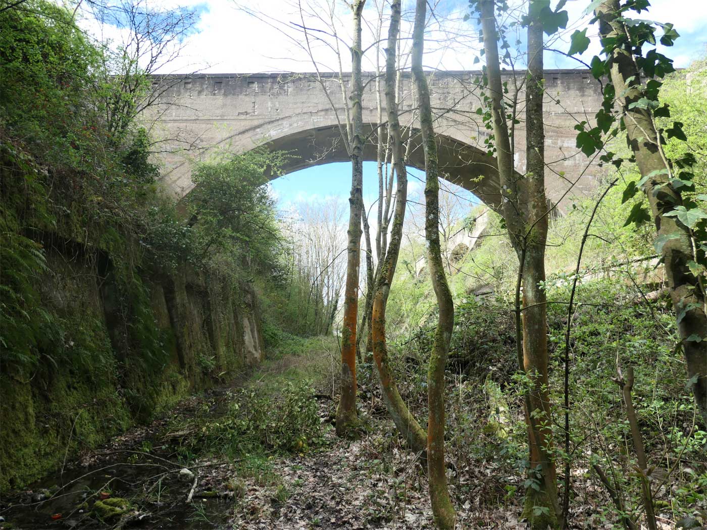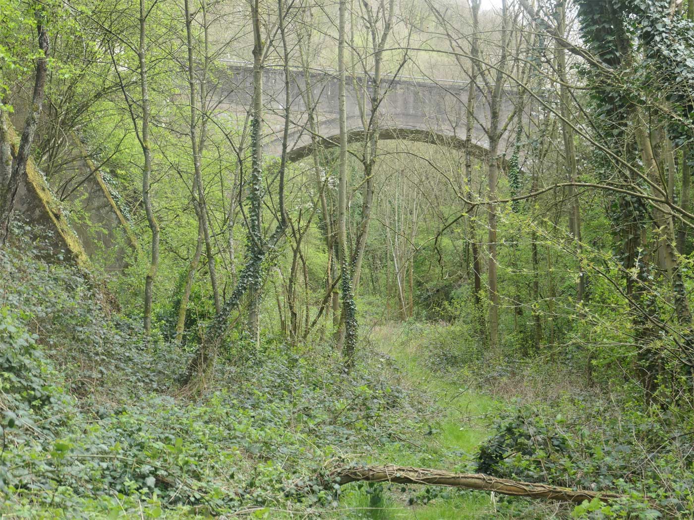 Brücke (Ludendorffbrücke) begann. Trassenreste sind im Bewuchs am rechten