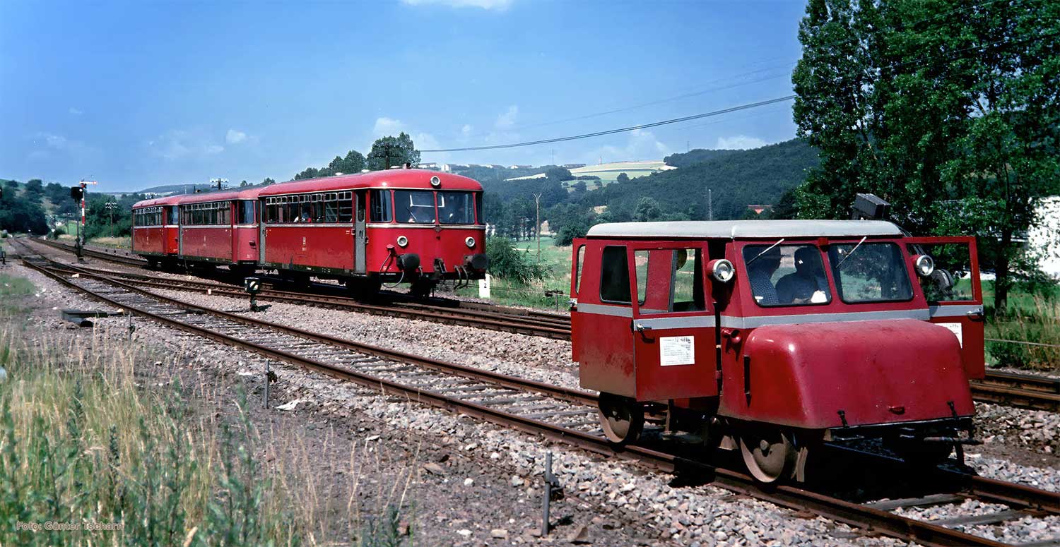 Im Vordergrund die Bahnmeisterei-Draisine Kleinwagen - Klv 12 - mit der Nummer 12 488