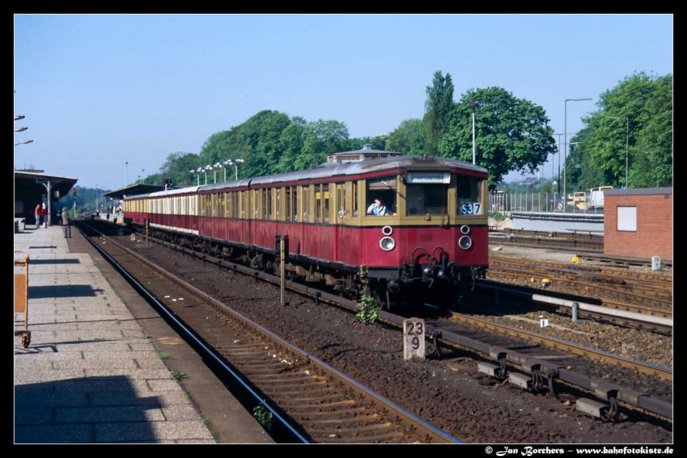 km 18,4 (rechts im Bild) gehört zur Wannseebahn (Gegenrichtungsgleis) Berlin-Wannsee im Mai 1990 - 275 037 verlässt den Bf in