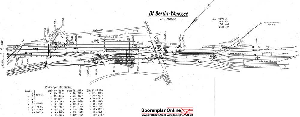 Rechts oben km 16,8 der Strecke Berlin-Zehlendorf, W 1; km 12,184 (Stw Zwt) -