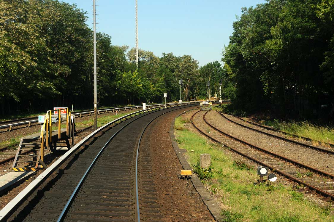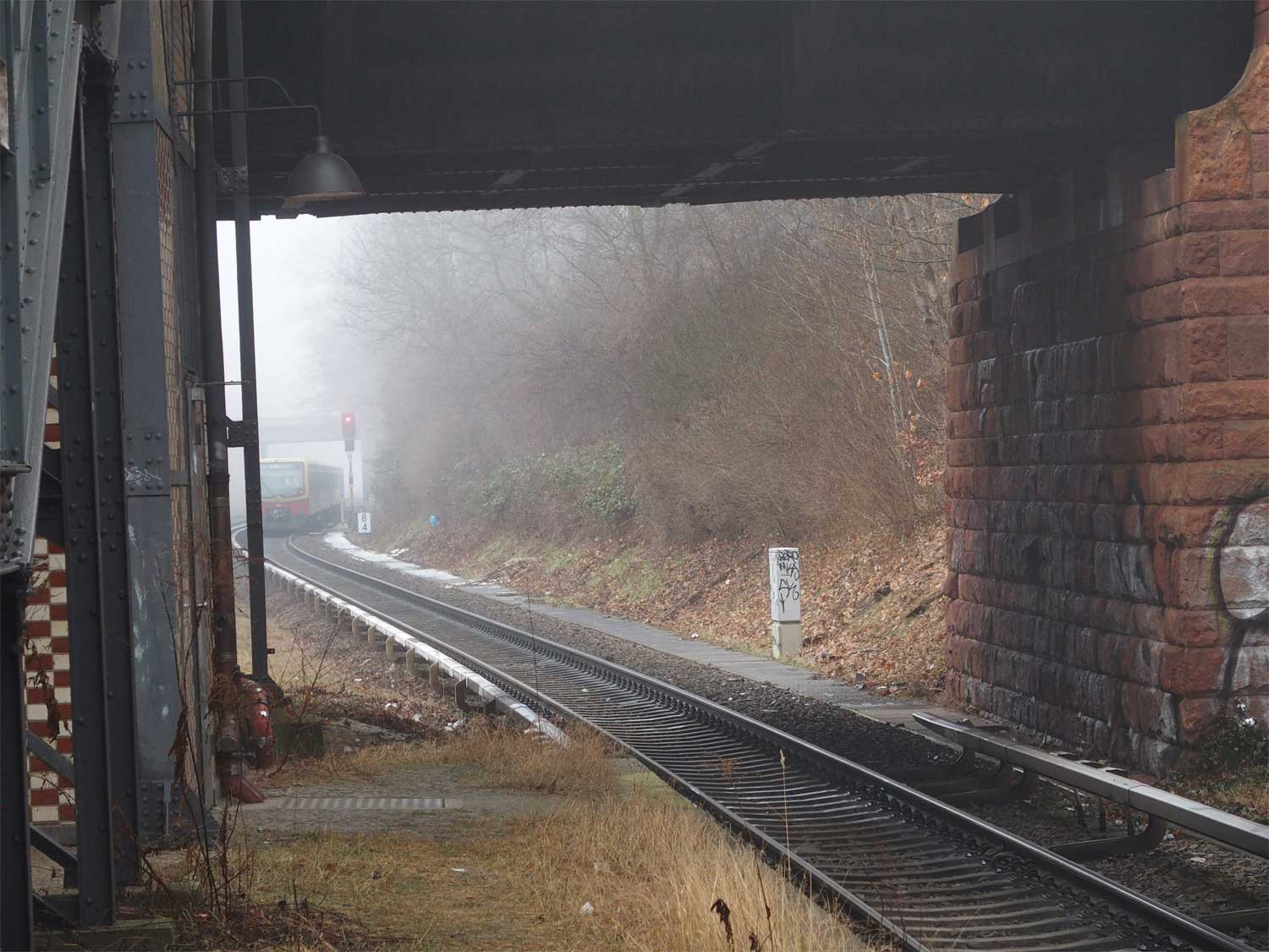 Links unter dem Durchgang ist km 17,0 der Wannseebahn zu