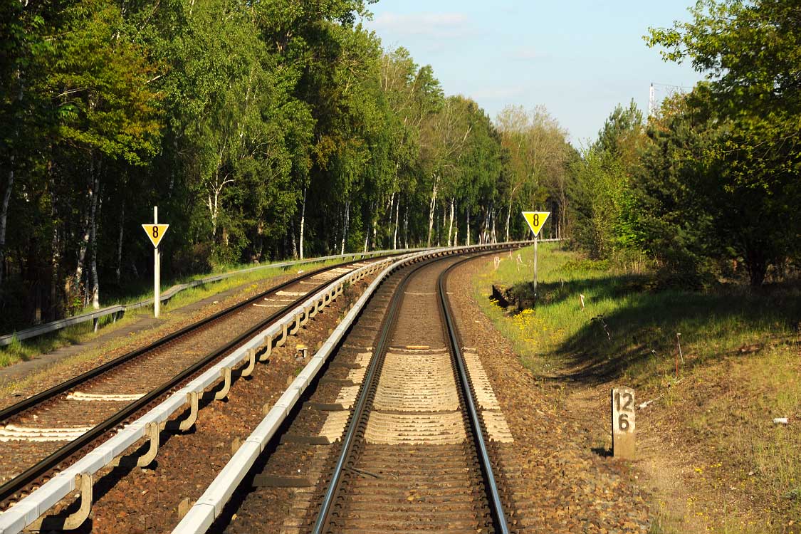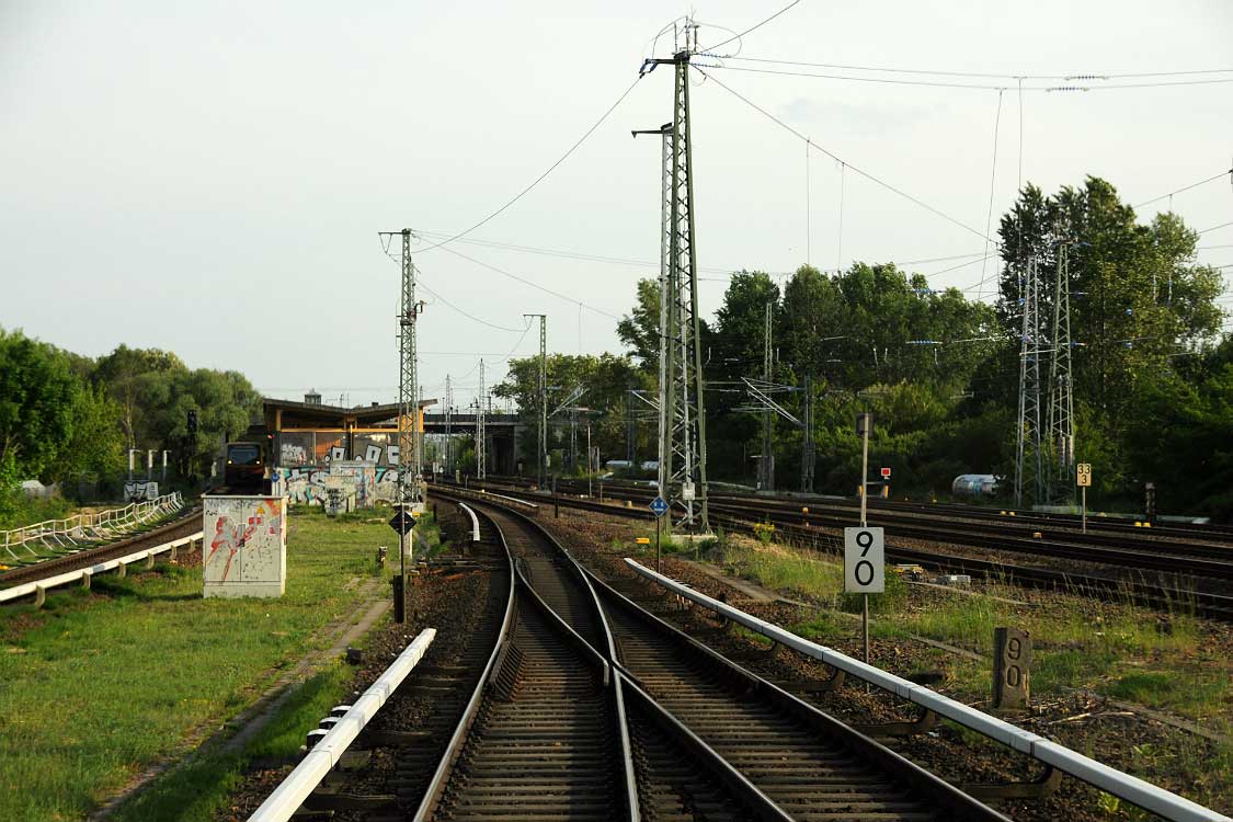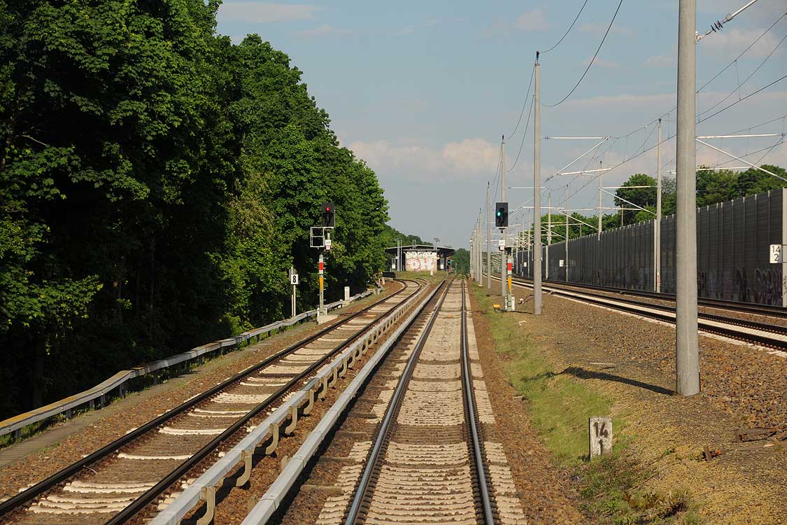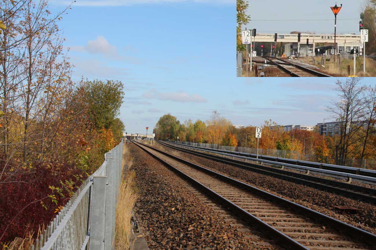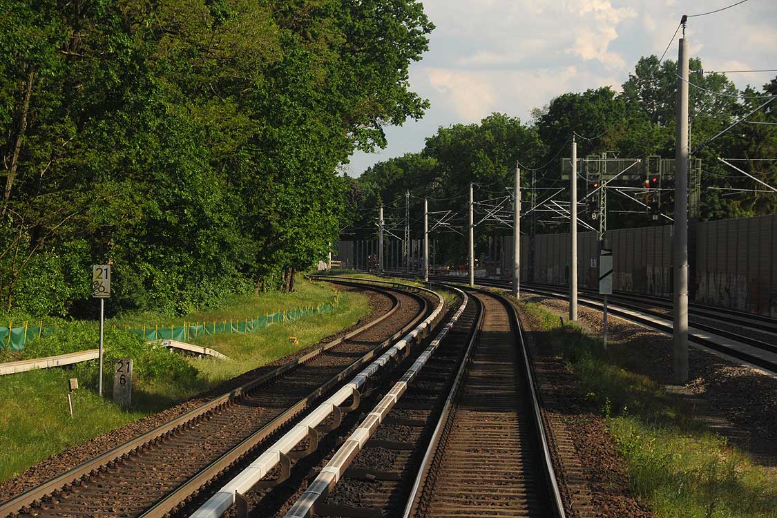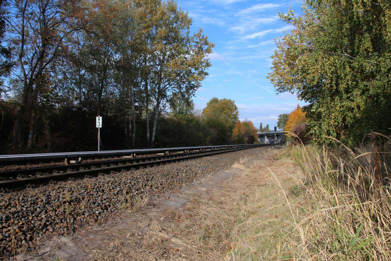 Mittig die beiden Gleise der Schlesischen Bahn mit km 10,2
