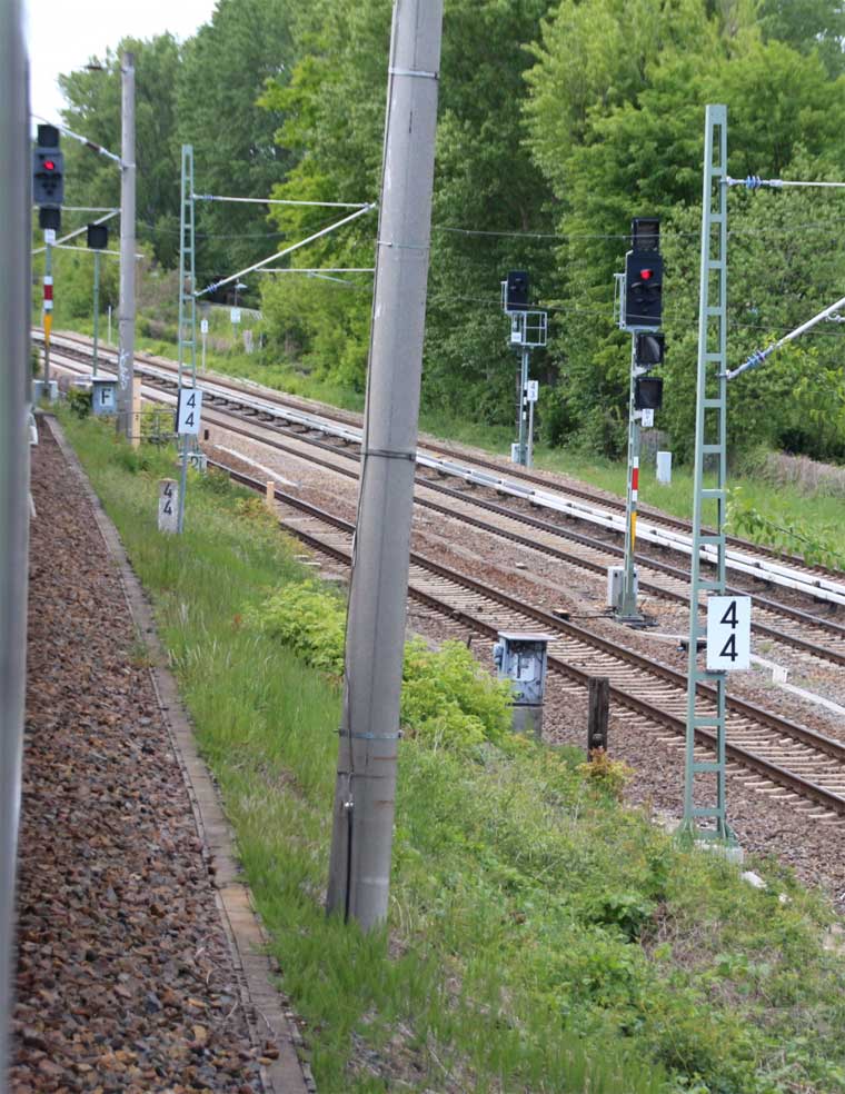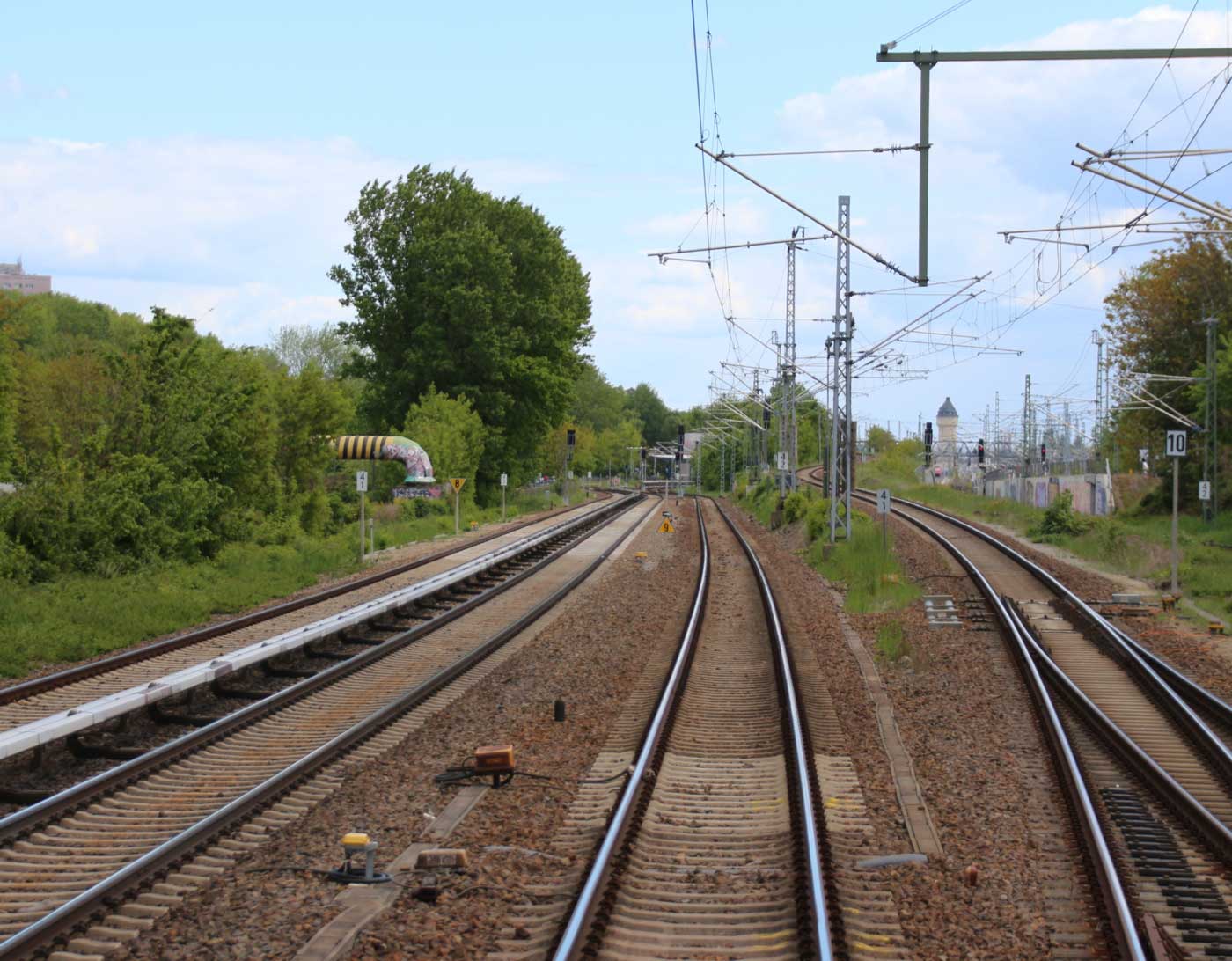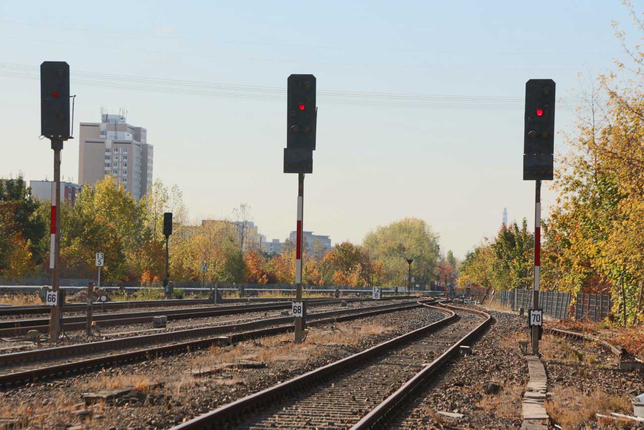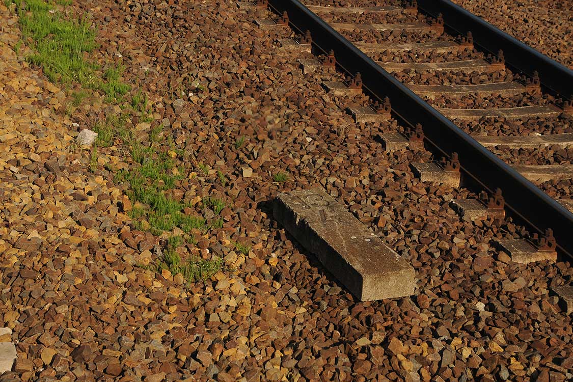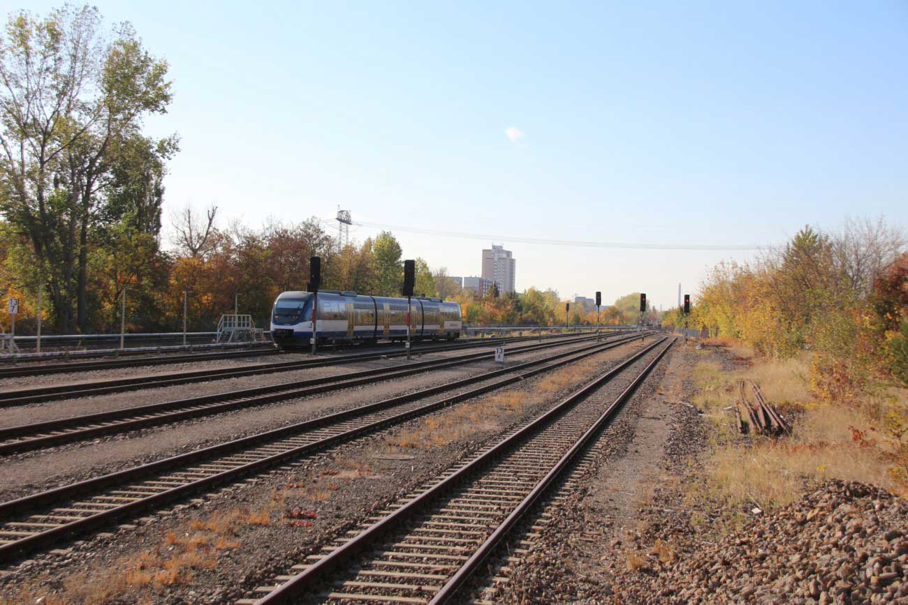 Mittig die beiden Gleise der Schlesischen Bahn mit km 10,2