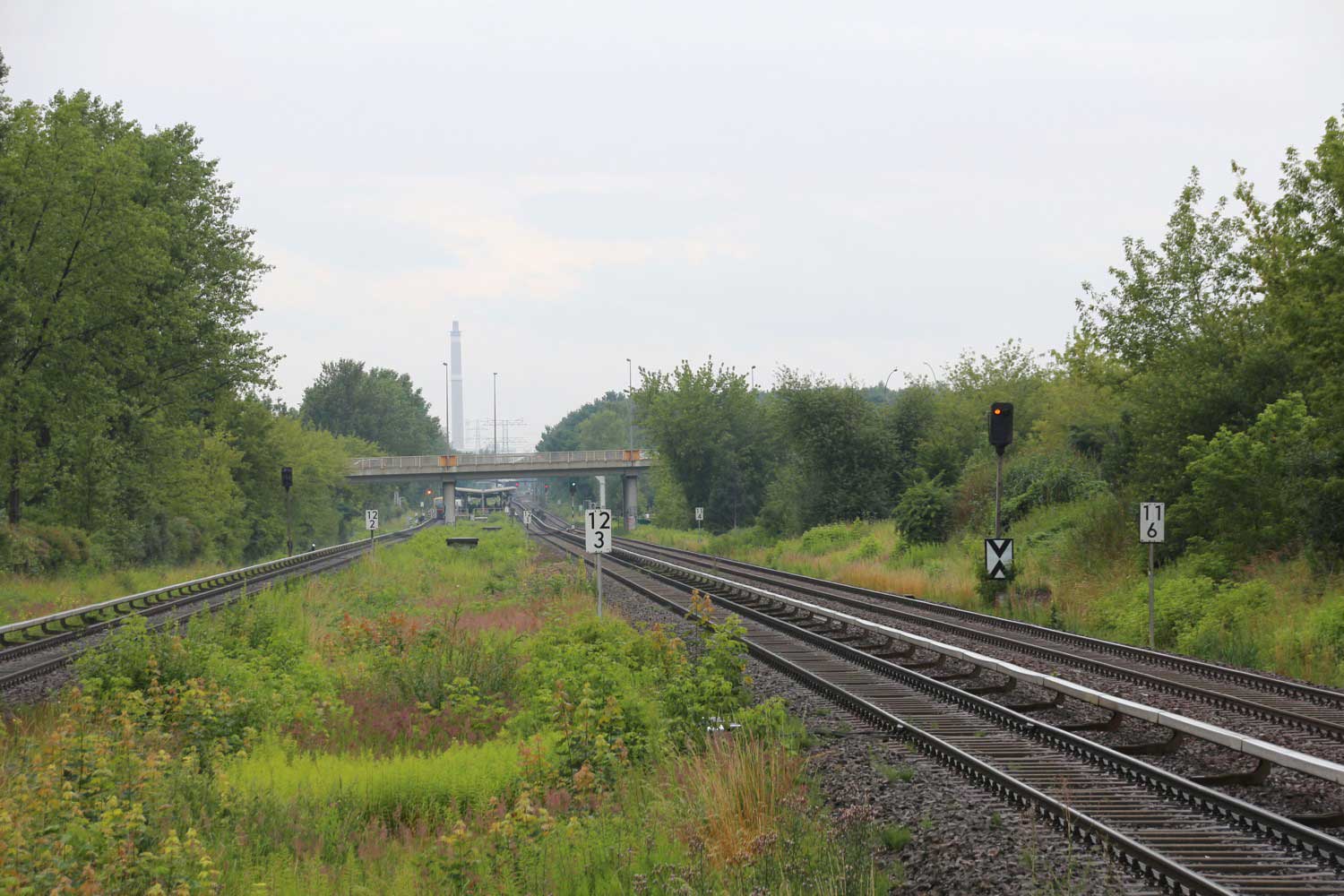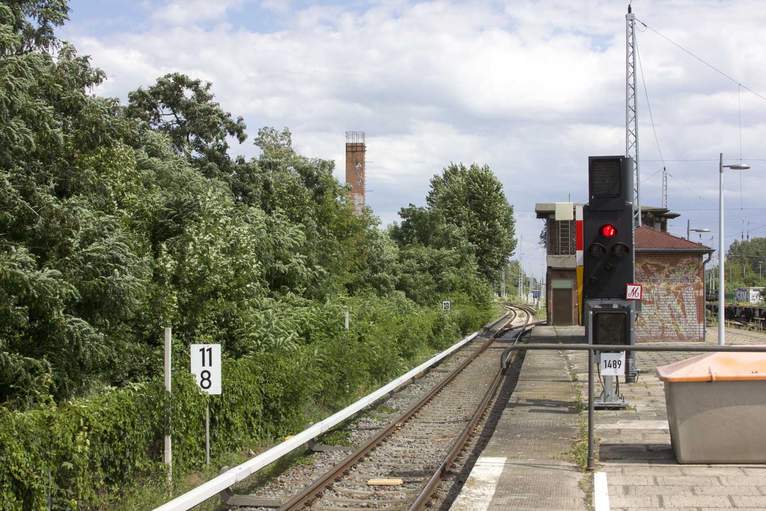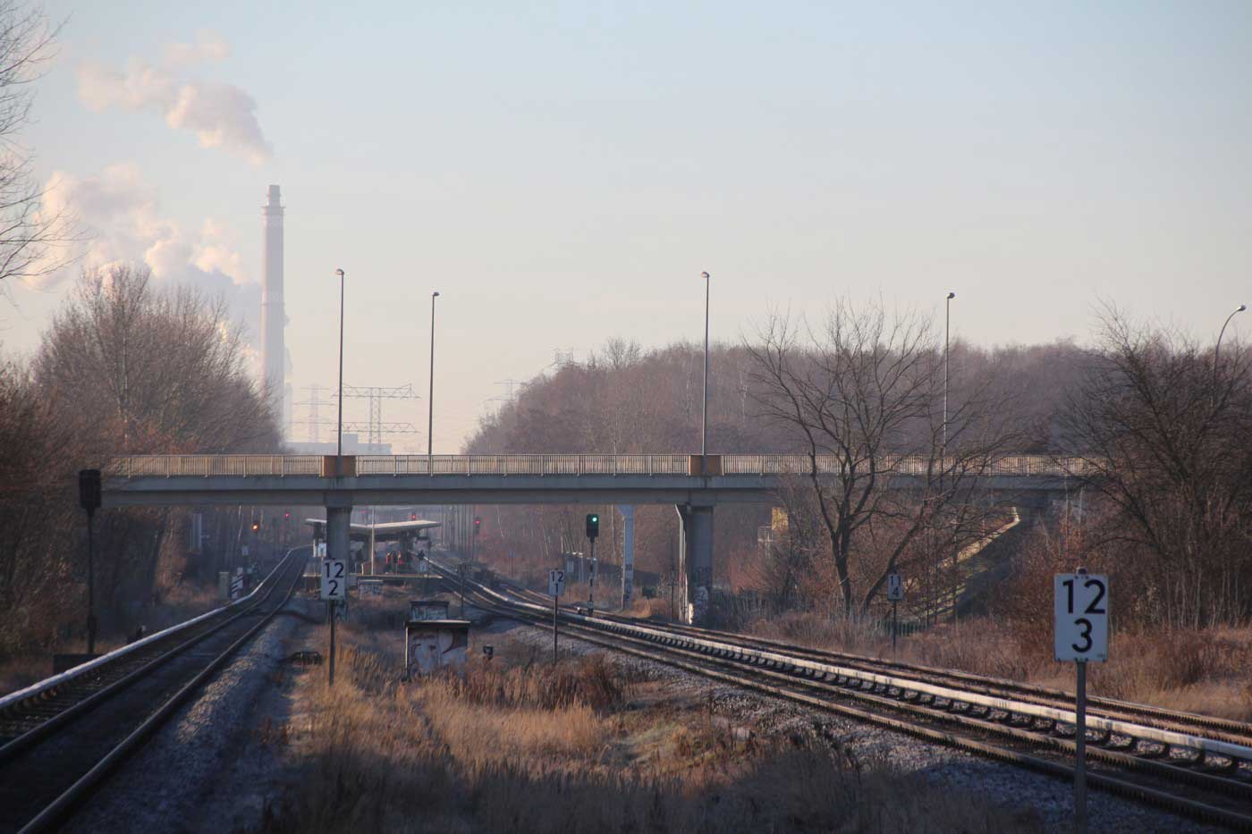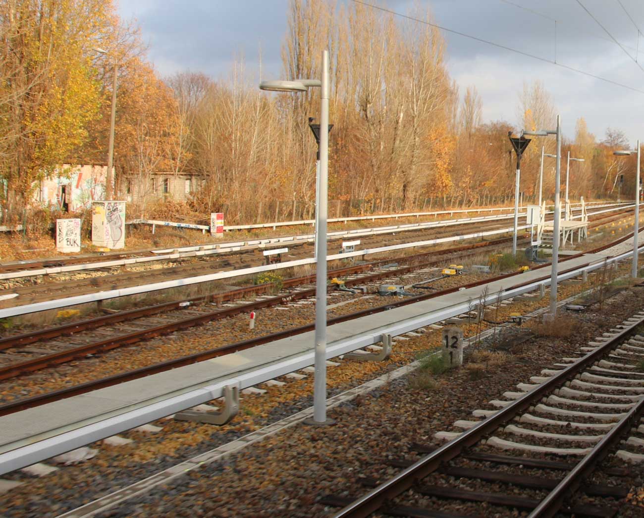 Ganz links das Gleis der Wriezener Bahn mit km 12,2; km 12,4 und km 12,6