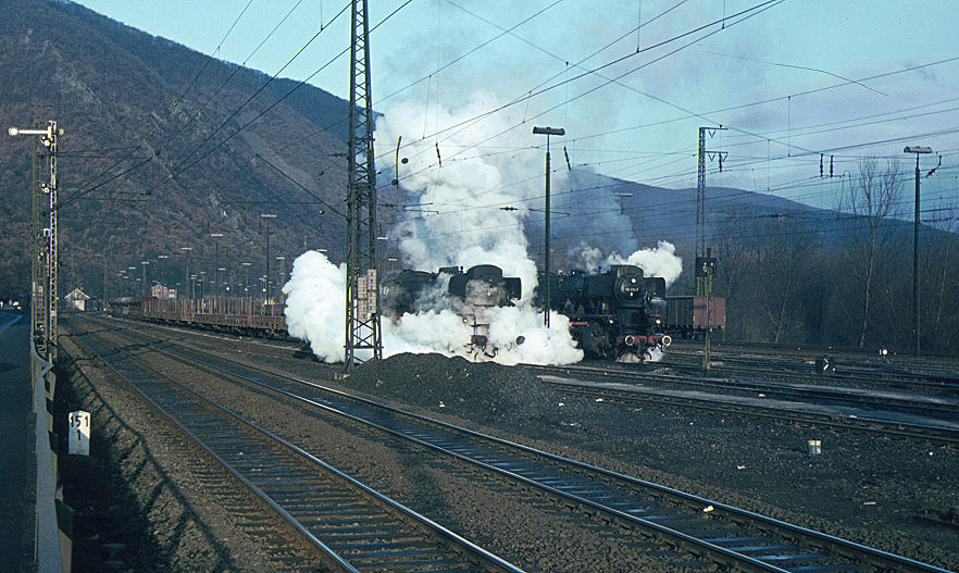 An einem kalten Februartag (1.2.1964) nimmt 50 4022 mit ihrem Güterzug Fahrt auf. Die 50 4019 wird in Blockabstand folgen.