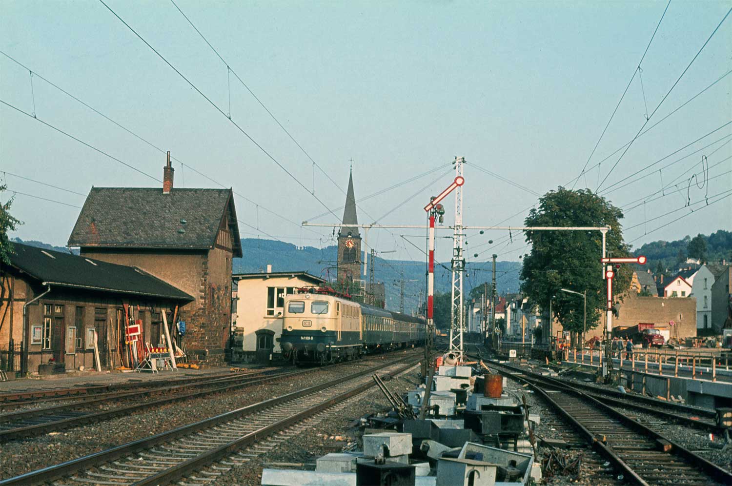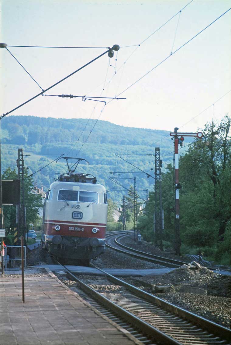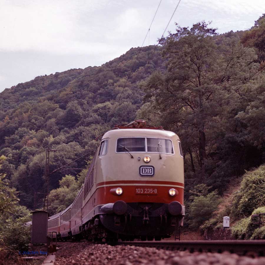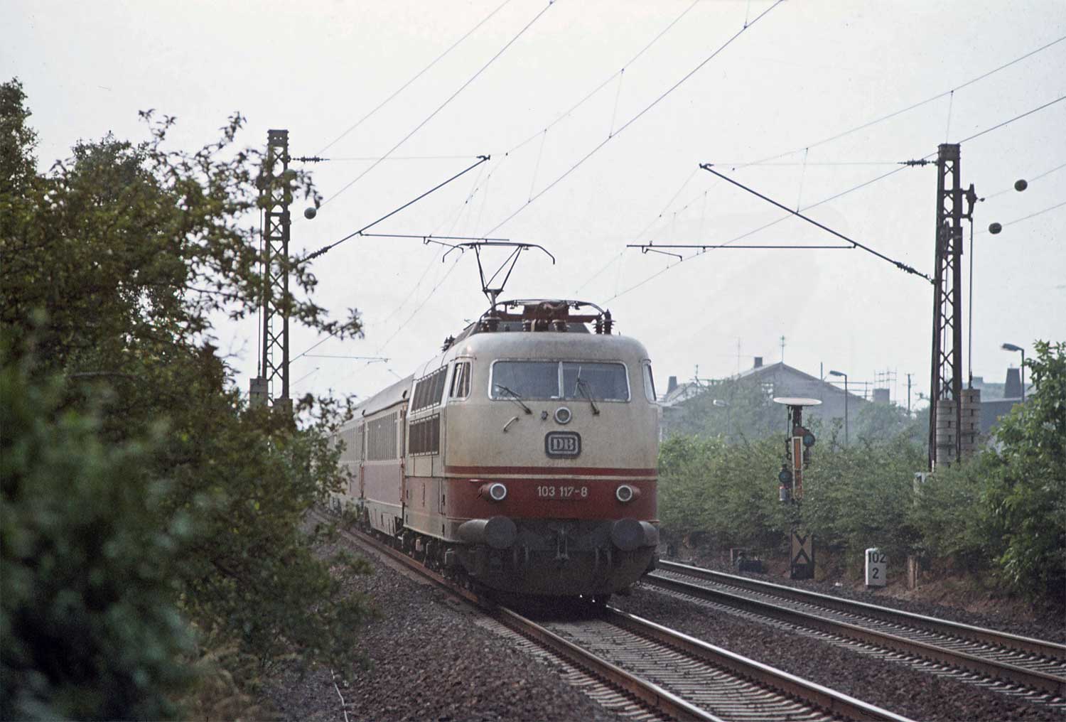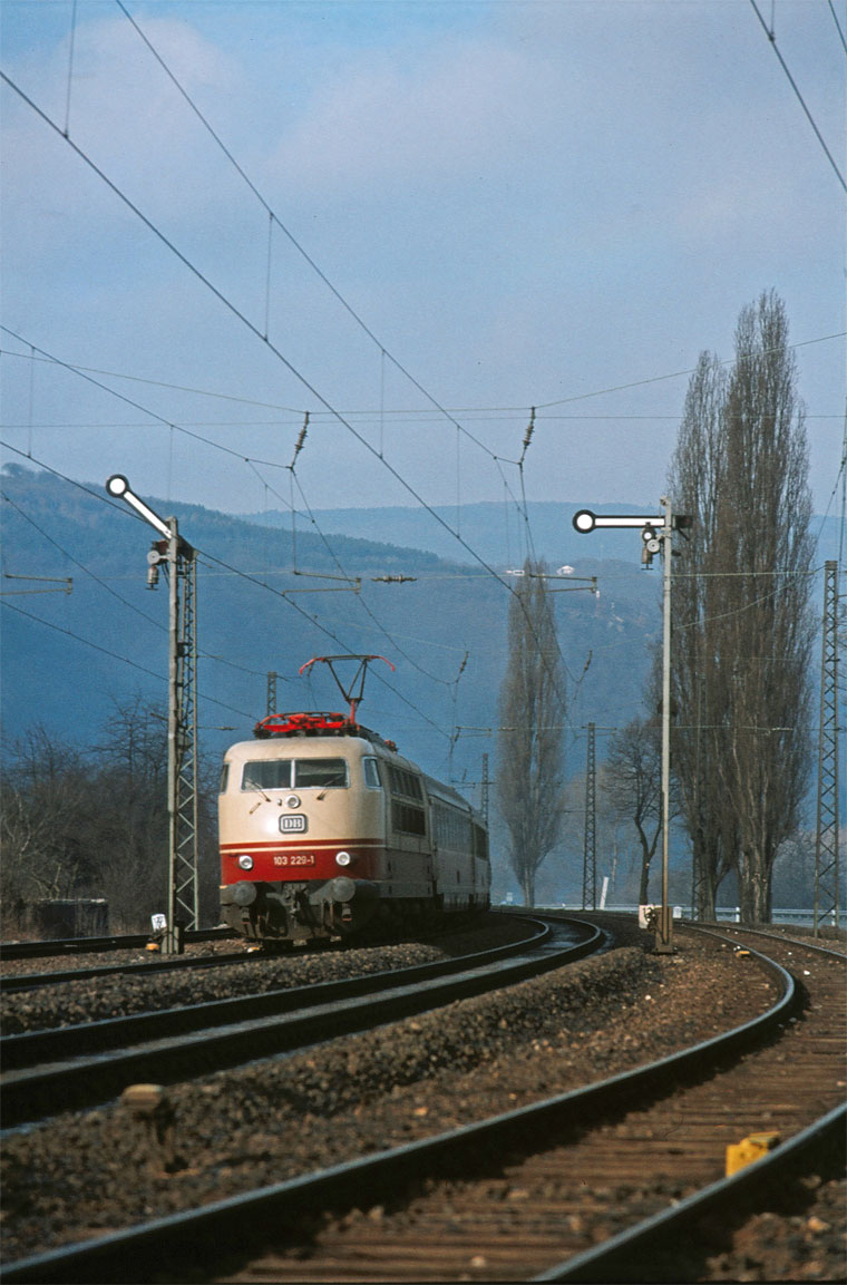 Mitten auf der Nahebrücke (Kilometer-Wechsel 0,0) rollt am 8. Juli 1981 die noch geschürzte 103 228 mit ihrem IC 524 HEINRICH DER LÖWE (München - Braunschweig) Richtung Bingerbrück; das Einfahrtsignal alter Bauart steht noch.