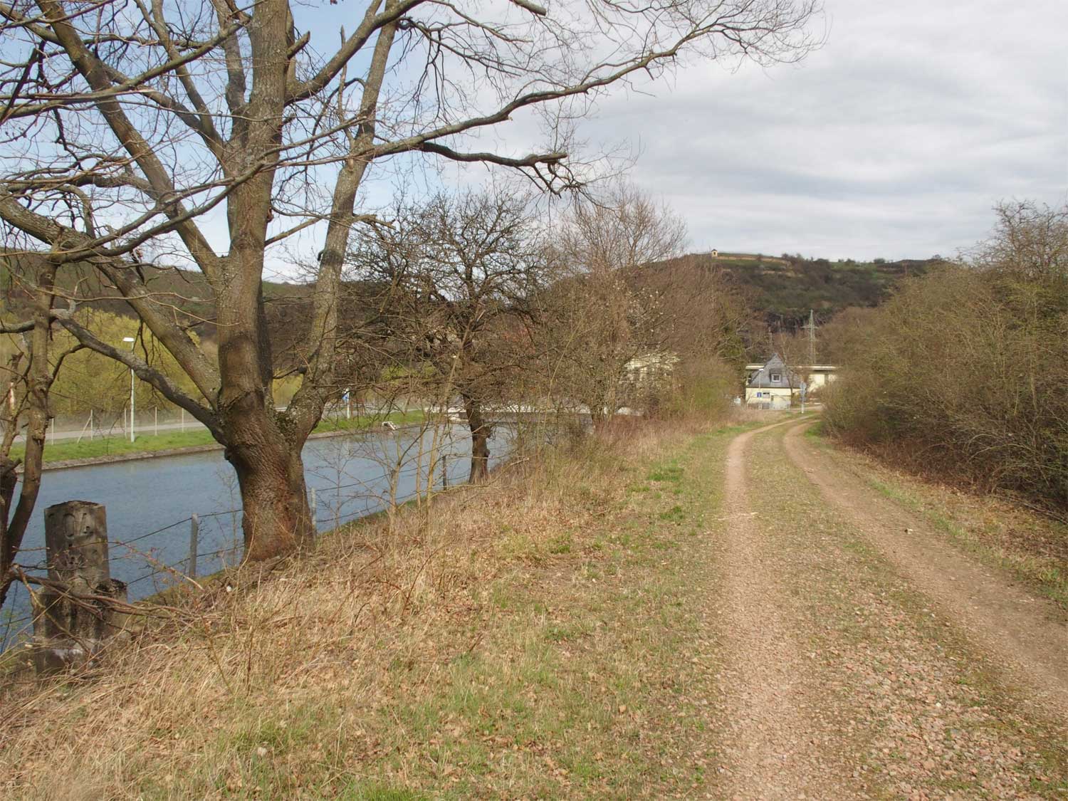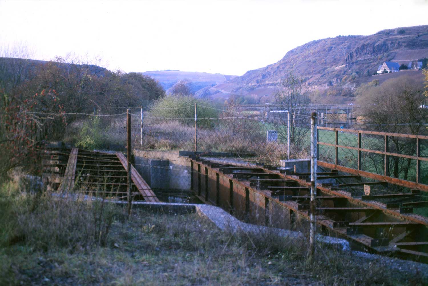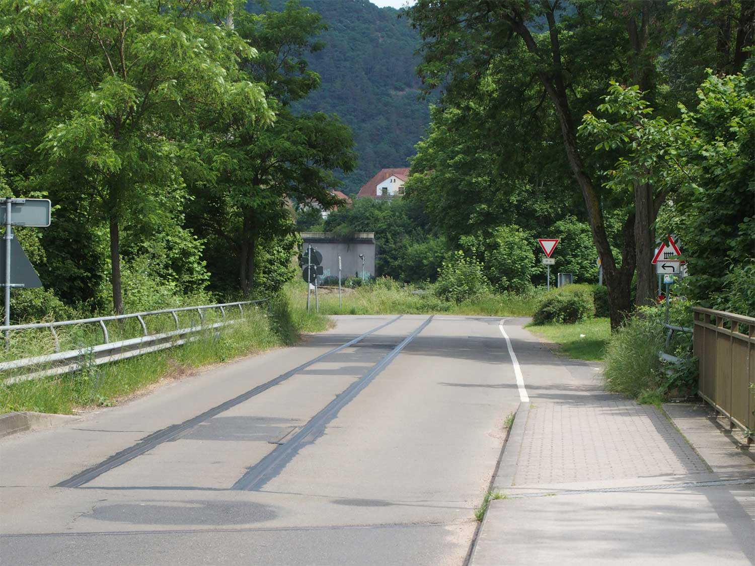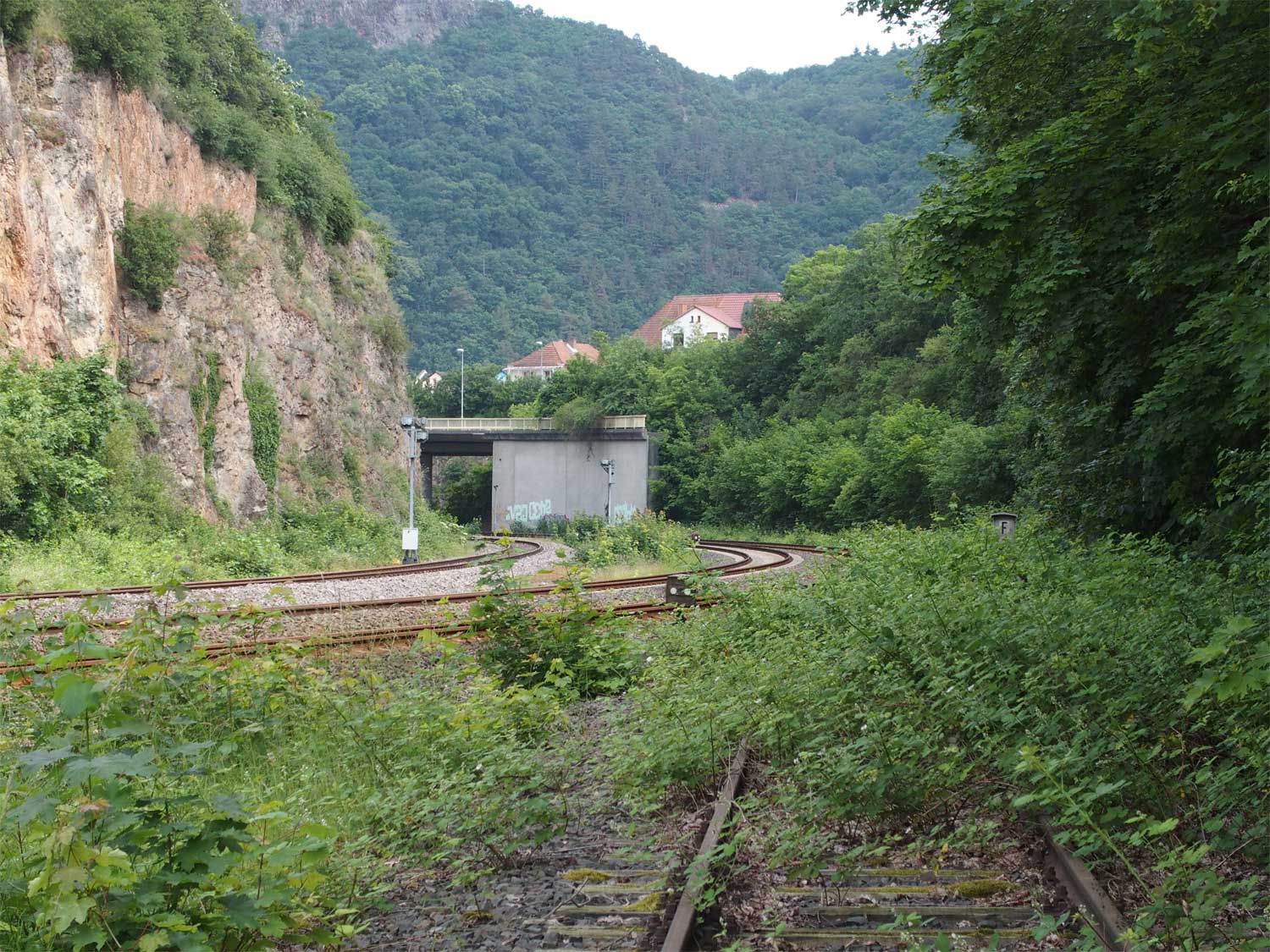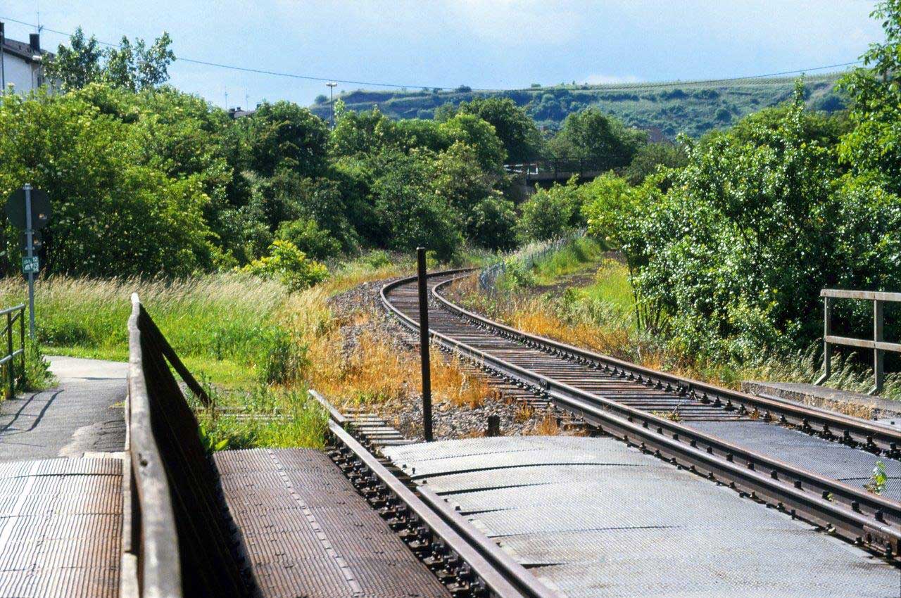 Rechts der Abzweig des ehemaligen Zufahrtsgleises zum RWE-Kraftwerk Niederhausen