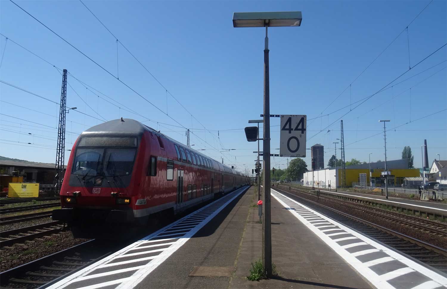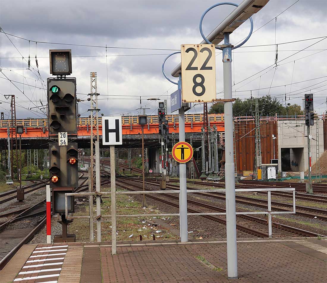 | km 0,0 der Strecke Frankfurt (Main) Hbf 0,0 - Wiesbaden Ost 37,80 - Wiesbaden-Biebrich 39,47 - Niederlahnstein 123,82 - km 125,70 = km 154,68 (auch Angabe: 125,72 = 154,66) von Mülheim (Ruhr)- Speldorf 0,18 (siehe auch Tabelle 3, Ziffer 2) | ||