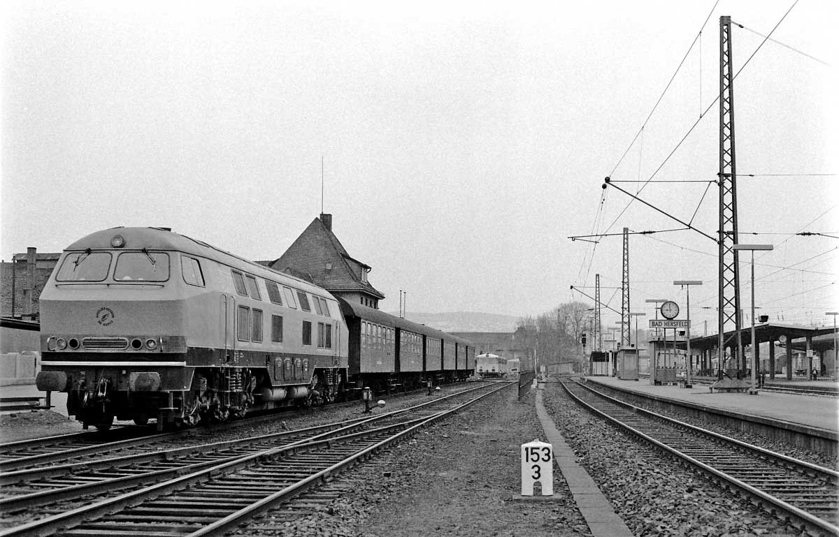 km 153,2 in Bad Hersfeld - Schienenbus und die V100 PA am 21.08.1984