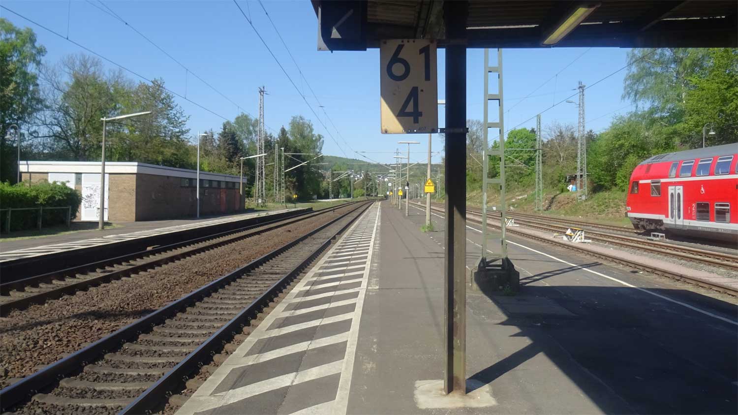 | km 0,0 der Strecke Frankfurt (Main) Hbf 0,0 - Wiesbaden Ost 37,80 - Wiesbaden-Biebrich 39,47 - Niederlahnstein 123,82 - km 125,70 = km 154,68 (auch Angabe: 125,72 = 154,66) von Mülheim (Ruhr)- Speldorf 0,18 (siehe auch Tabelle 3, Ziffer 2) | ||
