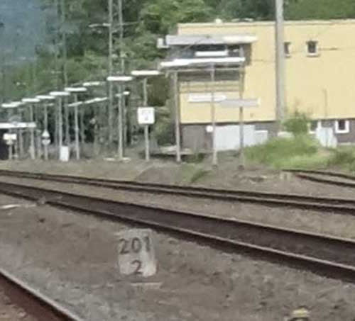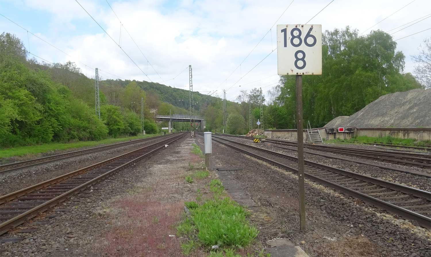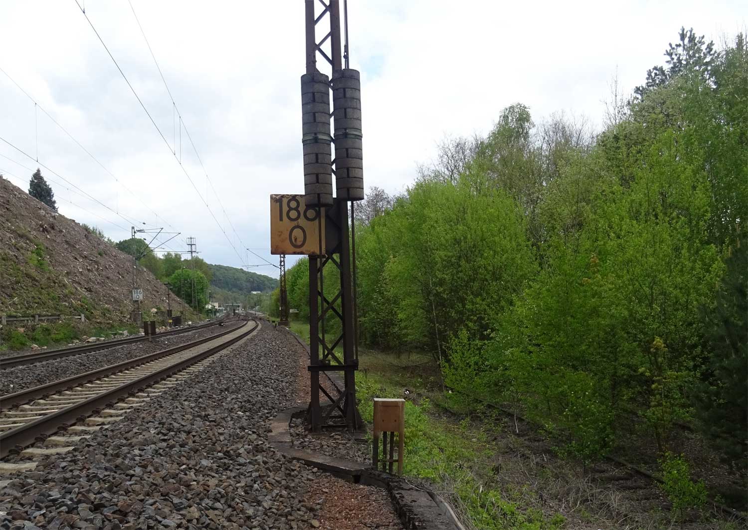 | km 0,0 der Strecke Frankfurt (Main) Hbf 0,0 - Wiesbaden Ost 37,80 - Wiesbaden-Biebrich 39,47 - Niederlahnstein 123,82 - km 125,70 = km 154,68 (auch Angabe: 125,72 = 154,66) von Mülheim (Ruhr)- Speldorf 0,18 (siehe auch Tabelle 3, Ziffer 2) | ||
