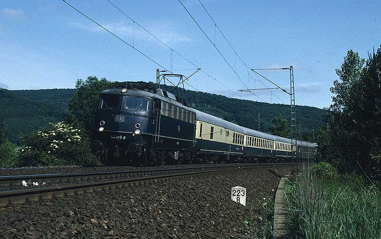 Frankfurt (Main) Hbf 0,0 - Hanau Hbf 22,98 - Schlüchtern 74,34 - (bis 1913: Elm 82,0 - Flieden 92,3) - (ab 1913 Distelrasentunnel) Flieden 85,240 = 92,195 (siehe auch Tabelle 5, Ziffer 3) - Fulda 110,57 - Bebra 166,667 - Eichenberg 227,37 - Göttingen 247,11