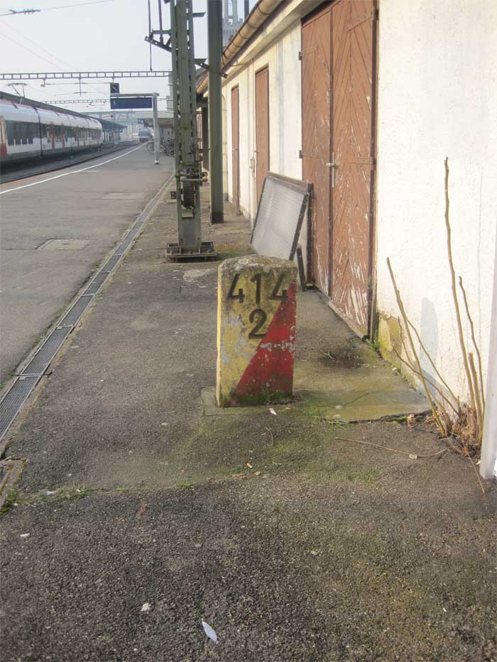 km 413,8 (Tafel) und km 414,0 (Stein) in Konstanz - Blick Richtung Mannheim