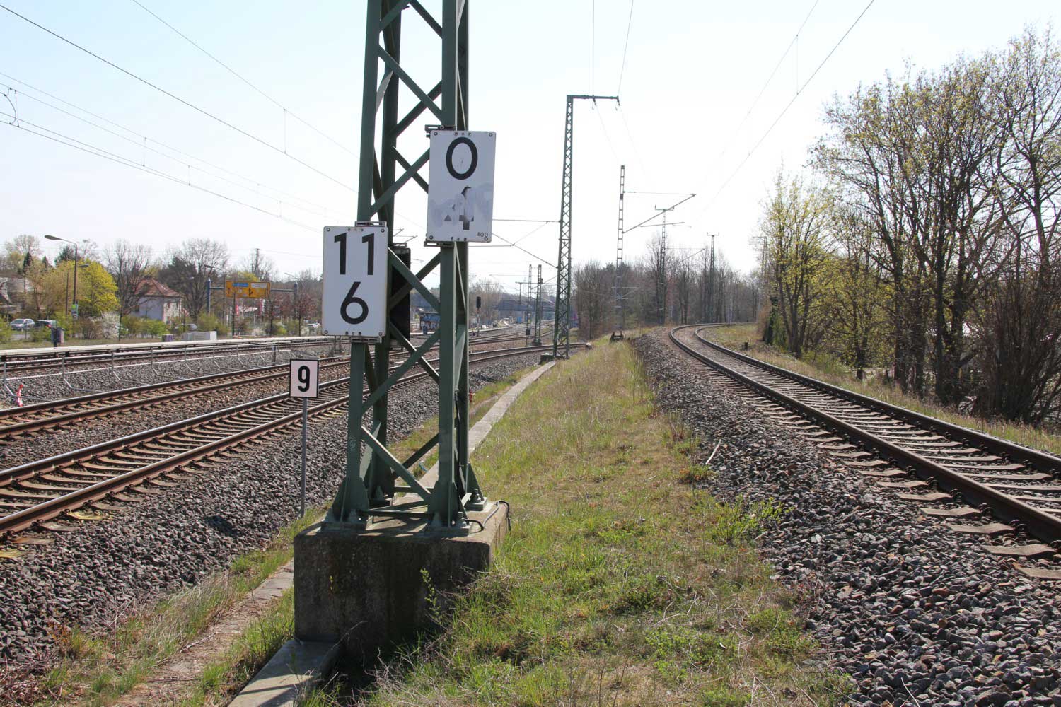 km 12,8 (Gegenrichtungsgleis, rechte Tafel) am Grünauer Kreuz - Blick Richtung Görlitz