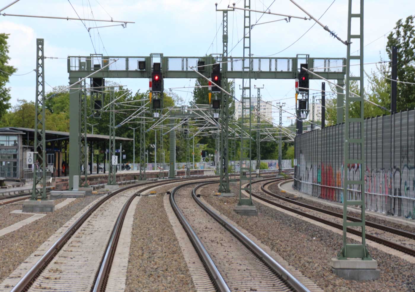 km 152,85 der Strecke Großenhain Cottb. Bf 0,0 - Senftenberg 45,29 - Cottbus 79,67 - Frankfurt (Oder) Pbf 152,85 (Personenzuggleise)/152,79 (Güterzuggleise) | ||