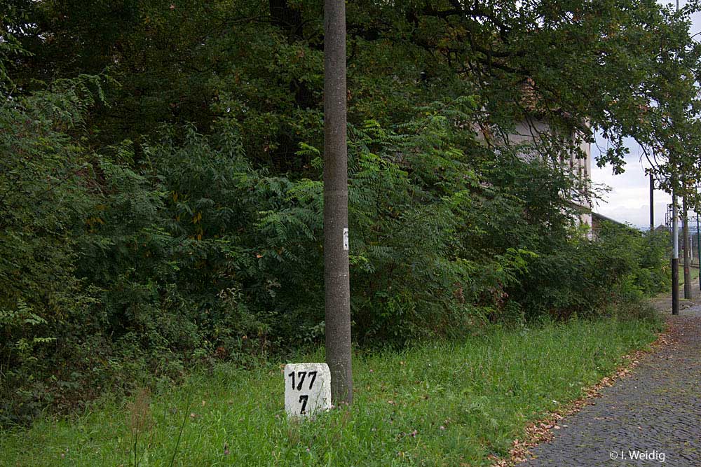 km 0,3 (links, Tafel und Stein) gehört zur Strecke