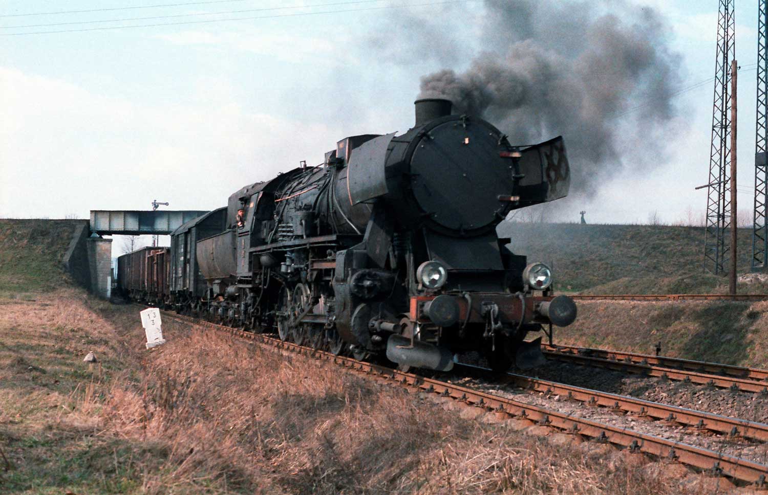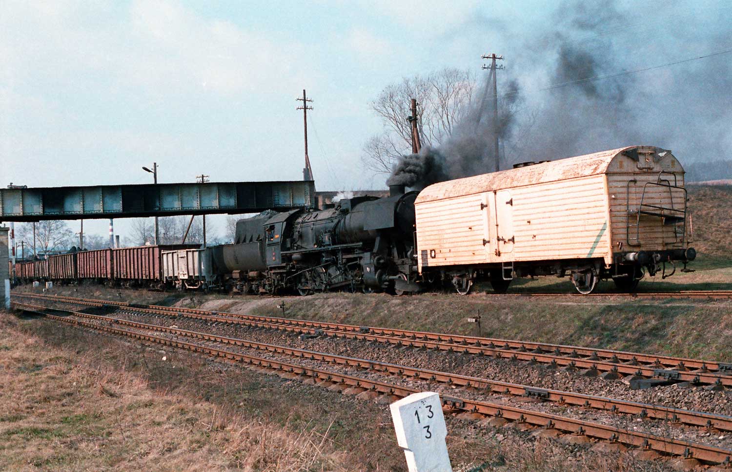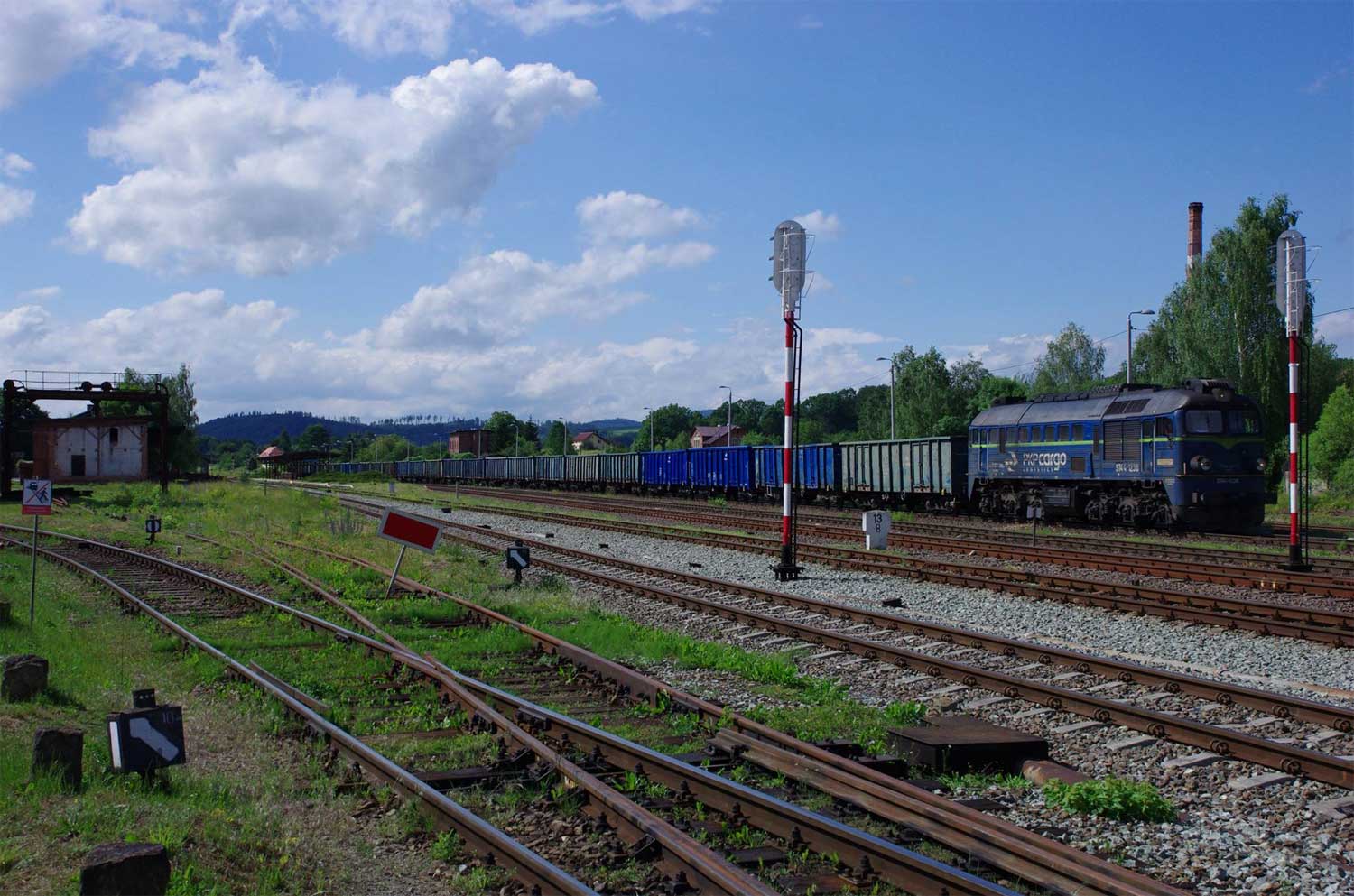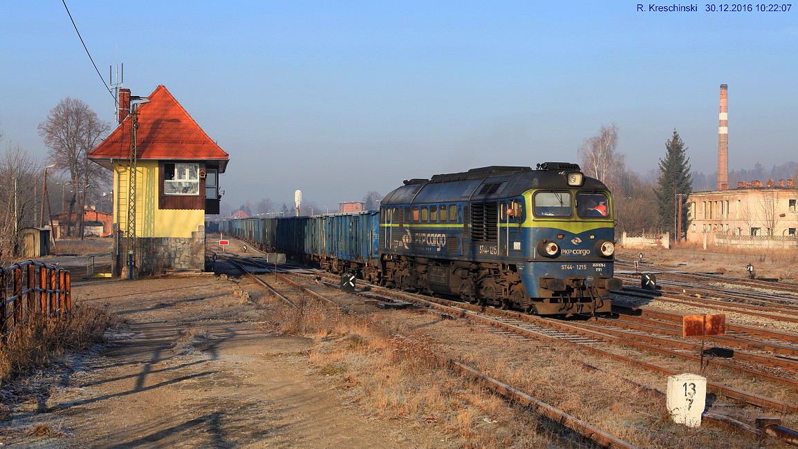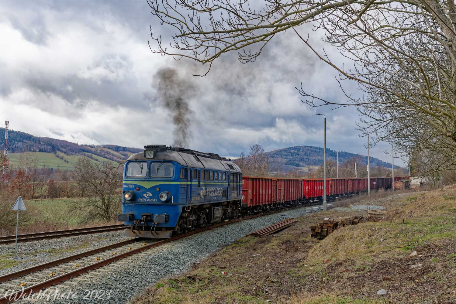 Umsetzten in Scinawka Srednia (Mittelsteine): ST44-1223 rangiert einen Schotterzug aus dem Kleinbahnhof Ścinawka Średnia Dworzec Mały (Mittelsteine Kleinbahnhof) zum Bahnhof.