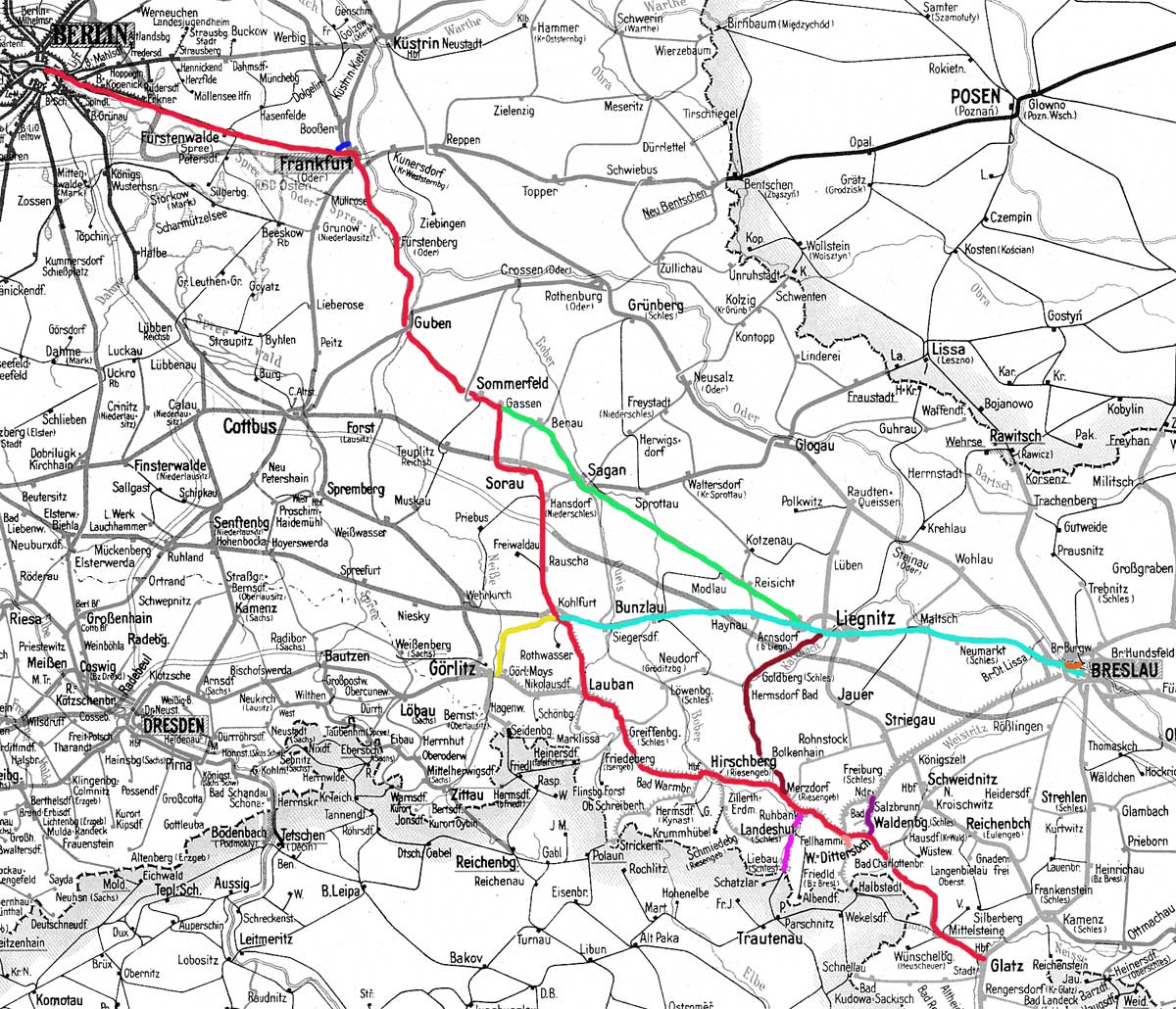 (Berlin Schlesischer Bf 0,10) - Kohlfurt 224,22 - Arnsdorf (b Liegnitz) 285,71 - Liegnitz 295,25 - Breslau-Mariahöfchen 353,36 - Breslau Hbf 360,21