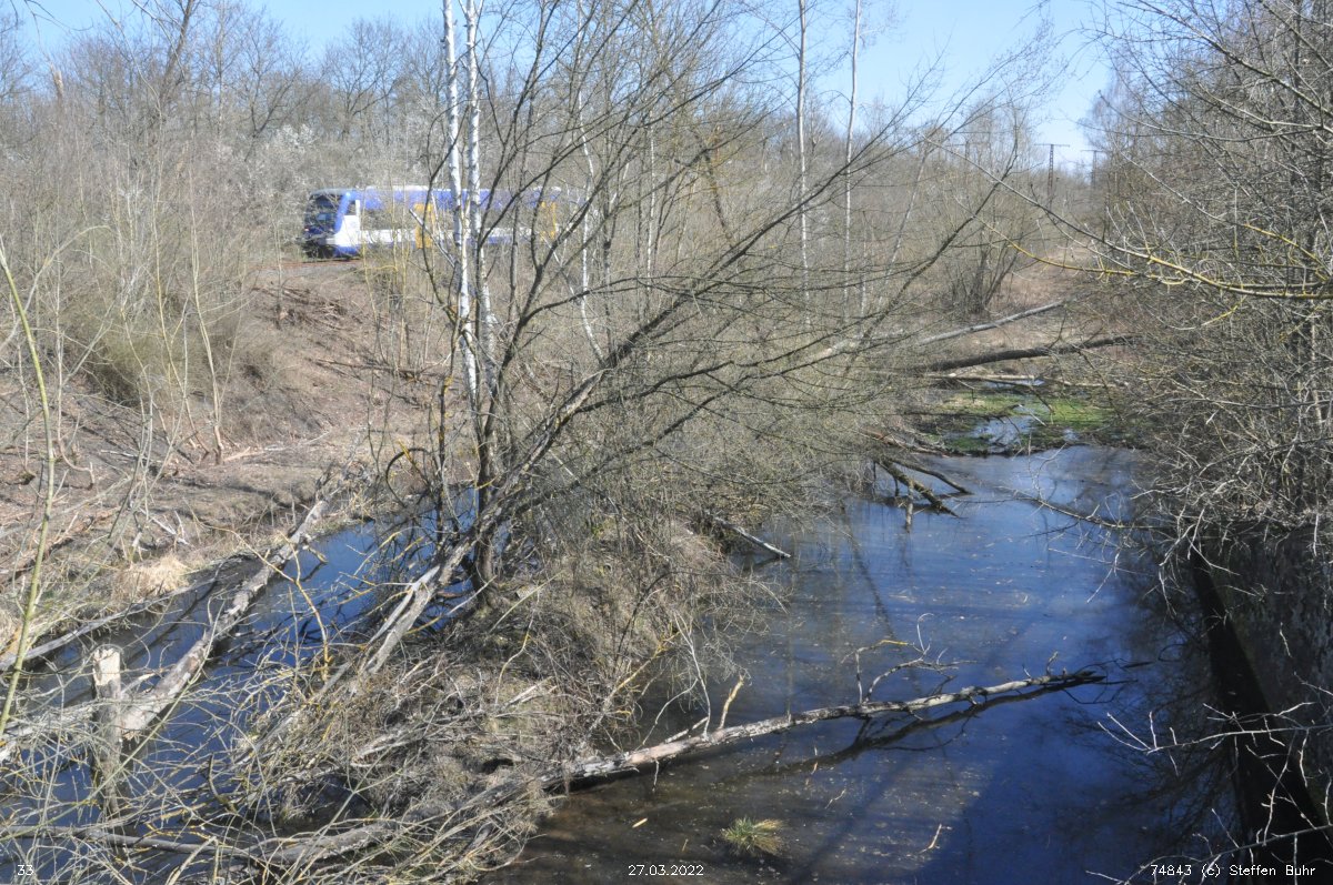 Der Triebwagen befindet sich auf der Strecke Eberswalde - Frankfurt (Oder) etwa bei km 127,6 und fährt Richtung Eberswalde