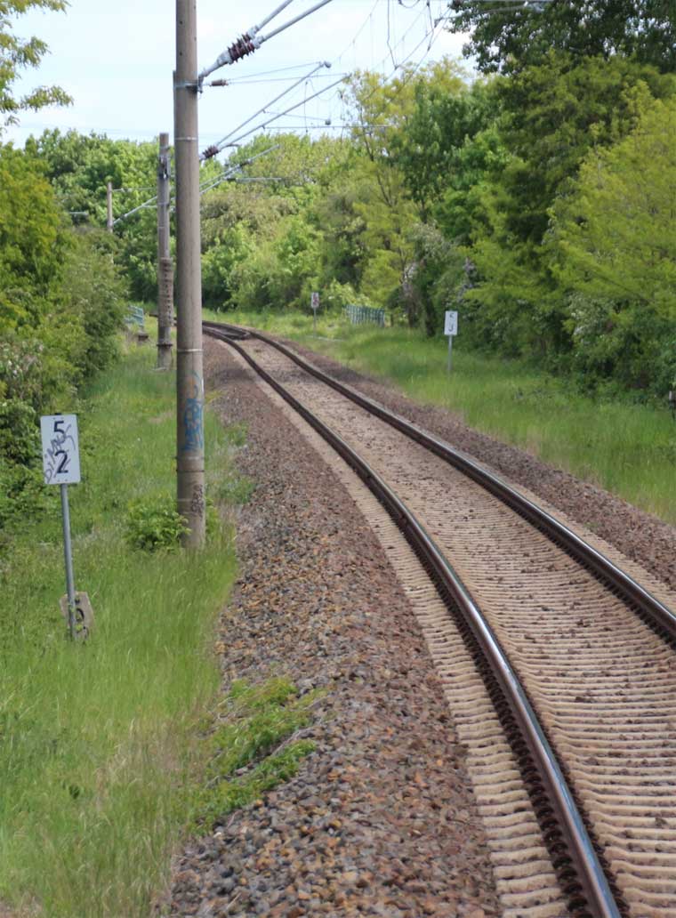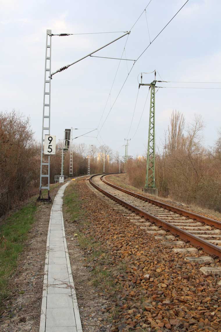 km 4,2 (Tafel am Oberleitungsmast) gehört zum Gegenrichtungsgleis der Strecke