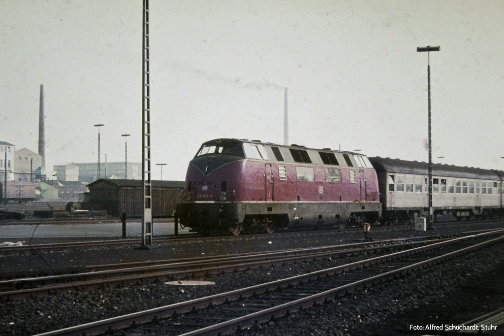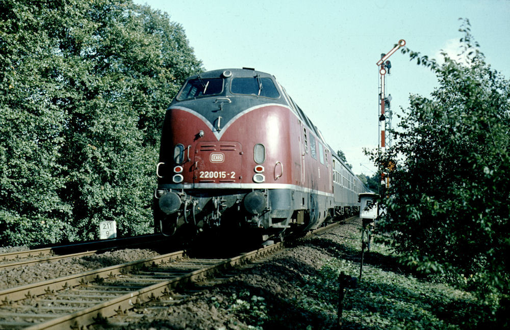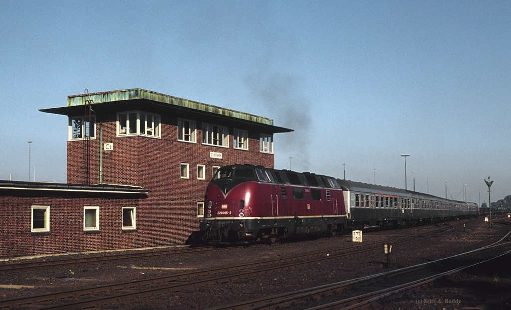 Cuxhaven, Stw. Cs am km 272,5 - 220 015 schiebt den abendlichen N 4469 aus dem Bahnhof
