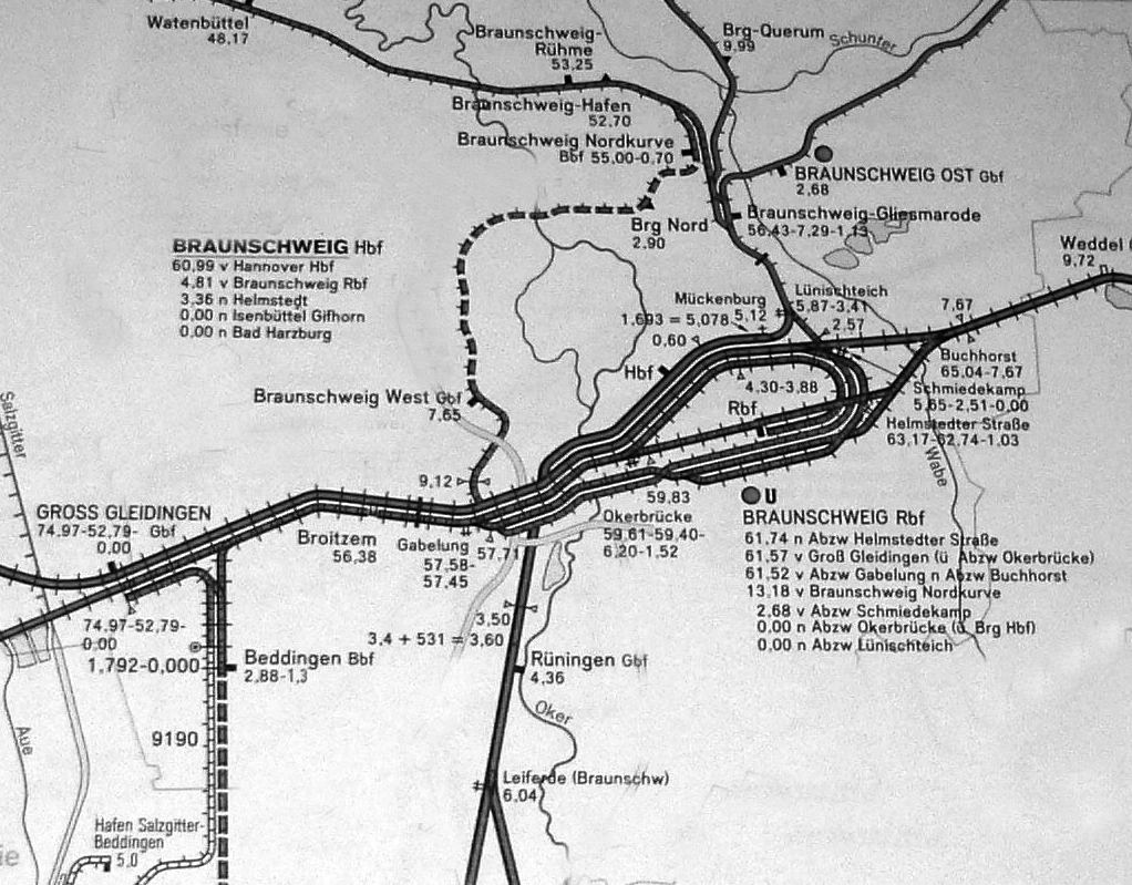 ► | km 58,18 der abgehenden Strecke (Hannover Hbf 0,0) - Abzw. Gab (Braunschweig Gabelung) 58,18 - Braunschweig Ost 60,89 mit weiterlaufender Kilometrierung (Streckenverzweigung mit gemeinsamen Nullpunkt Hannover Hbf) | |