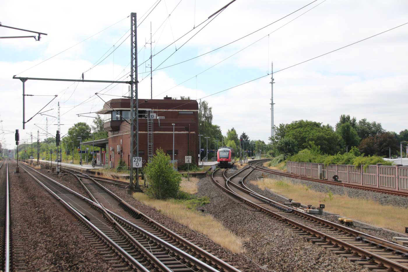 Rechts vom Stellwerk die Strecke (Hannover Hbf 0,0) - Lüneburg 131,56 - Büchen 161,31 mit gleicher Kilometrierung.