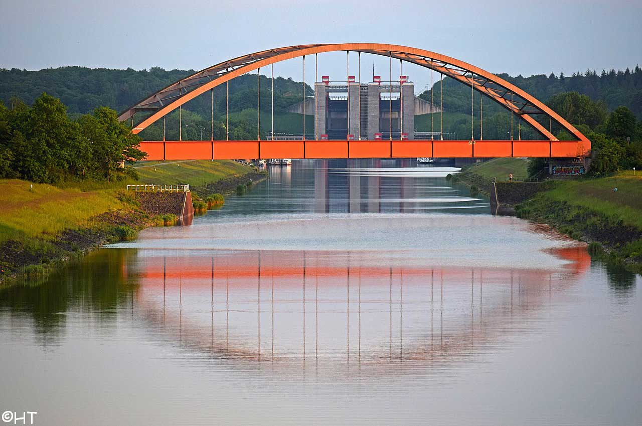 bei km 139,6 zwischen Adendorf und Echem an der Kanalbrücke bei Scharnebek, dahinter Schiffshebewerk Lüneburg