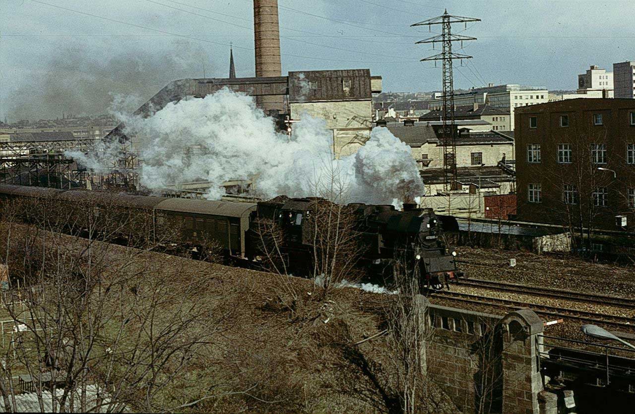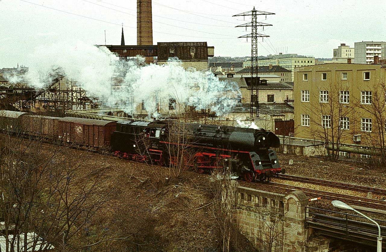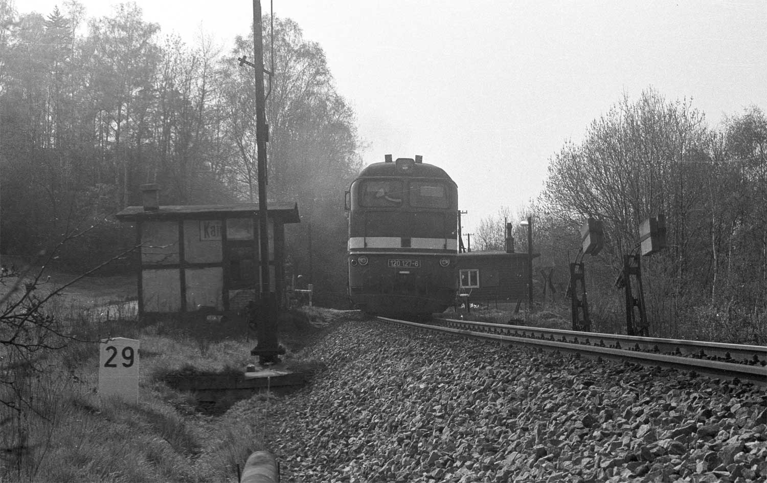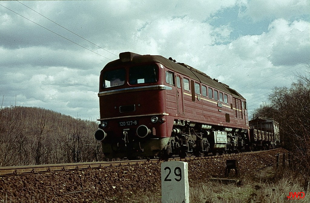 Am 26.03.1978 rollt 120 127-6 mit ihren kurzen Güterzug auf den Hp Gera-Kaimberg zu und wird in ein paar Minuten in Gera Süd ankommen.