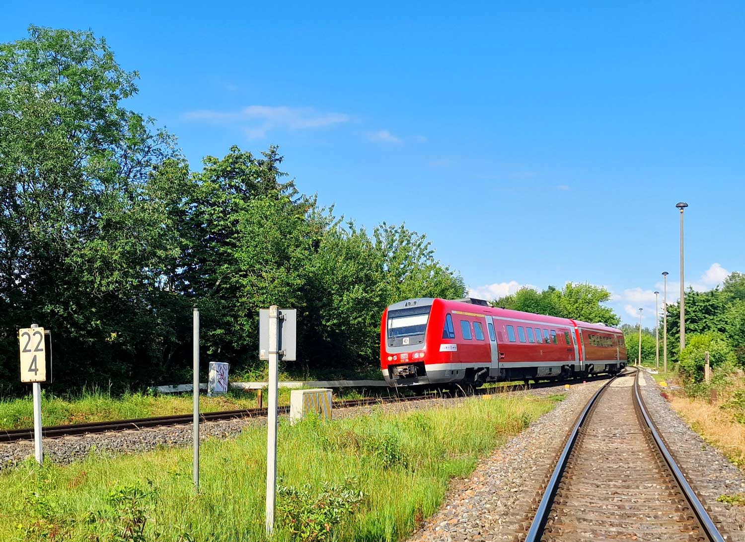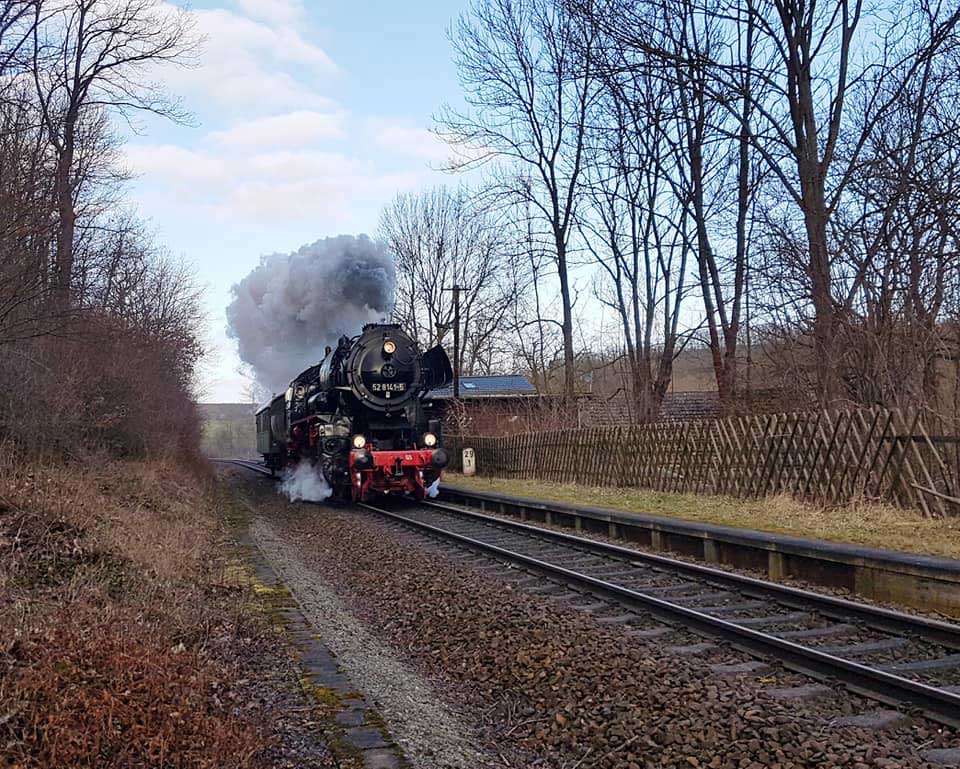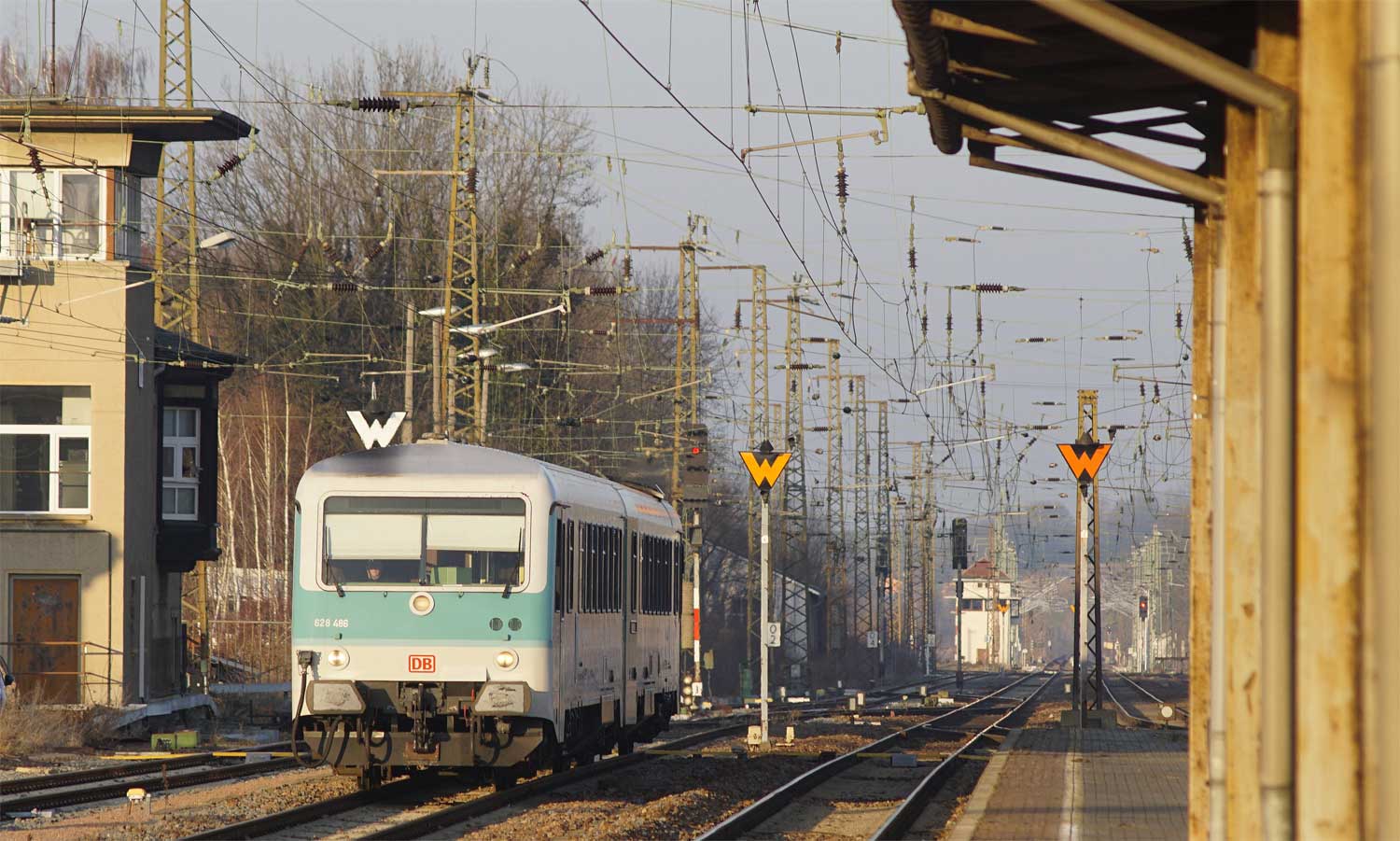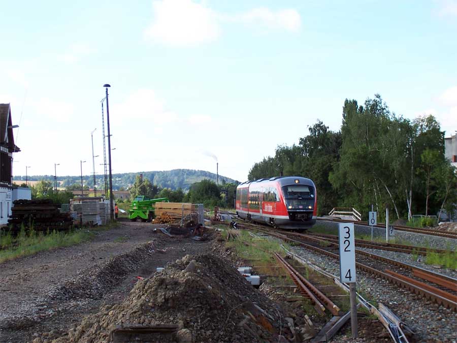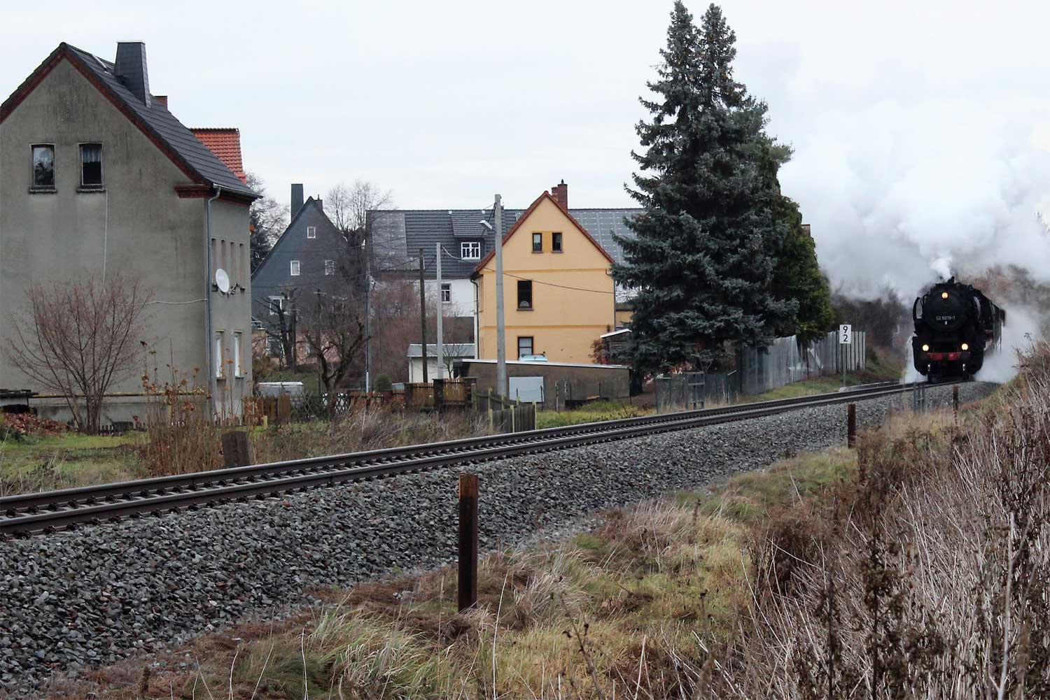 Gerade aus verlief die Strecke nach Weischlitz, die seit 2016 bei Wolfsgefärth von der Strecke Leipzig-Leutzsch - Probstzella abzweigt.