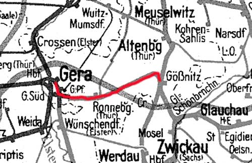 Gößnitz -0,37 - Ronneburg (Thür) 24,22 - Gera Süd 33,00 - Gera Hbf 34,66 (bis 1968) (GGa)