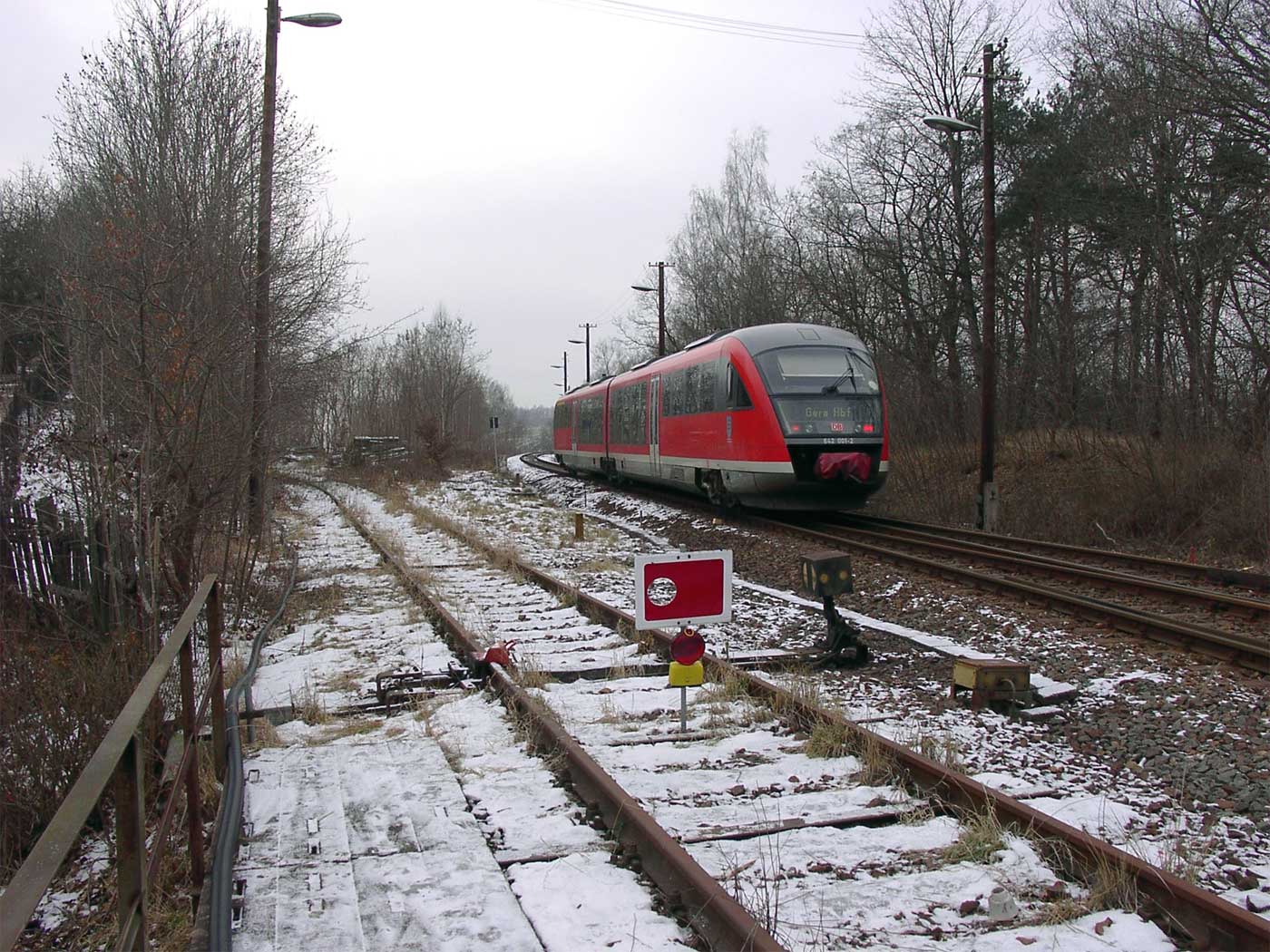Abzw Gera-Debschwitz 32,38 km 75,68 der Strecke (Leipzig Hbf 0,0) - Leipzig-Leutzsch 6,69 - Zeitz 44,61 - Gera Hbf 72,81 - Saalfeld (Saale) 140,01 - Probstzella 164,99 - Landesgrenze Thüringen/Bayern 166,66 = 52,91 - (Hochstadt-Marktzeuln 0,0)
