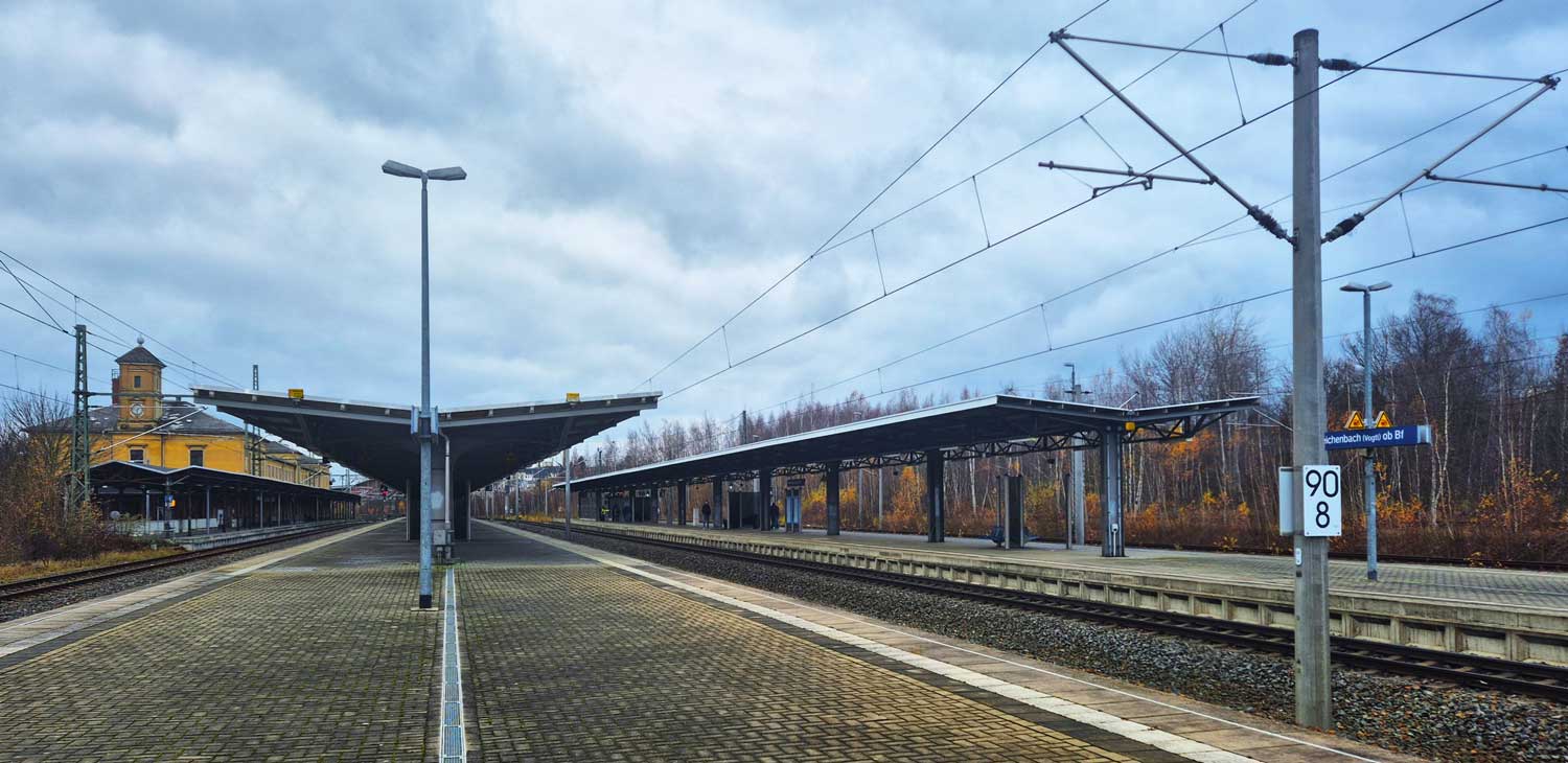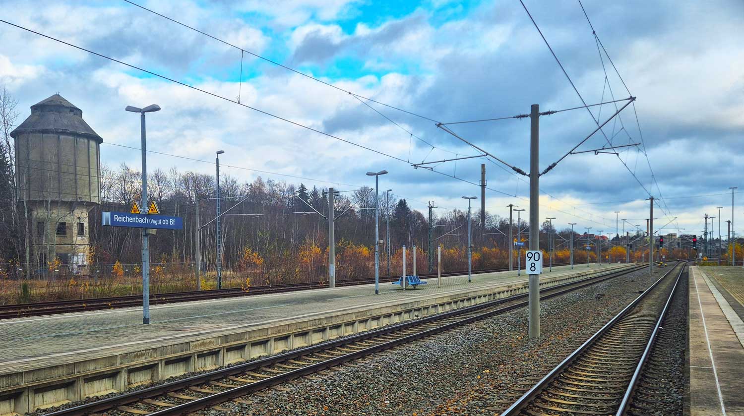 Reichenbach (Vogtland) ob. Bf | 90,96 | km 0,0 der Strecke Reichenbach (Vogtl) ob Bf 0,0 - Reichenbach (Vogtl) Ost 2,72 - Mylau 7,80 - Göltzschtalbrücke 9,03 (RMG) = [km 12,10 - Lengenfeld (Vogtl) 0,0 (LMG)] |